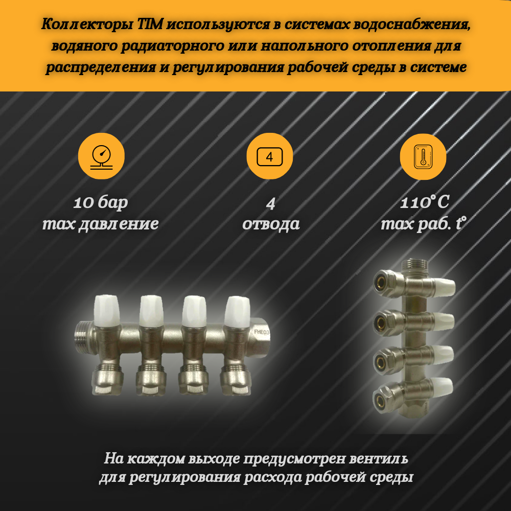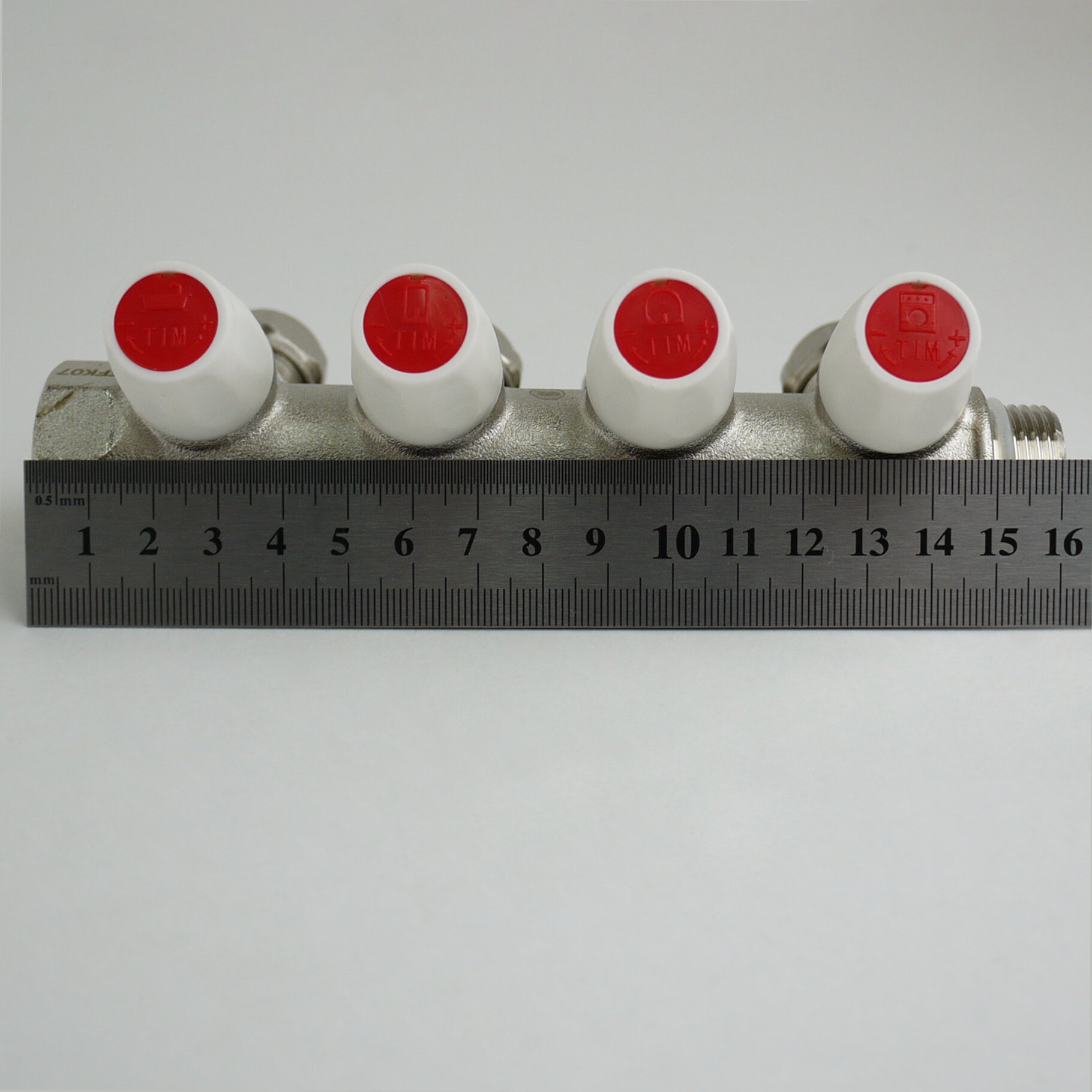Коллектор TIM MR135N-3/4-C-4, 3/4"х16 мм, внутренняя/наружная, 4 выхода, 45°, с вентилями