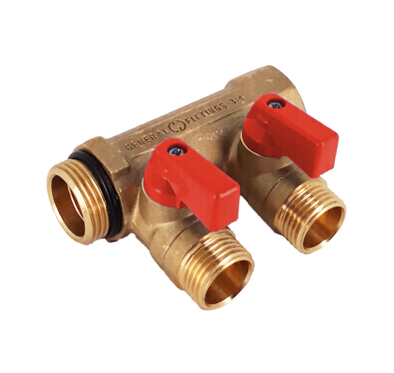 Коллектор 3/4"вр/нр х1/2"нр (2 выхода) GF (красный) с шаровыми отсекающими кранами, латунь, для труб металлопласт., сшитого полиэтилена интересное: