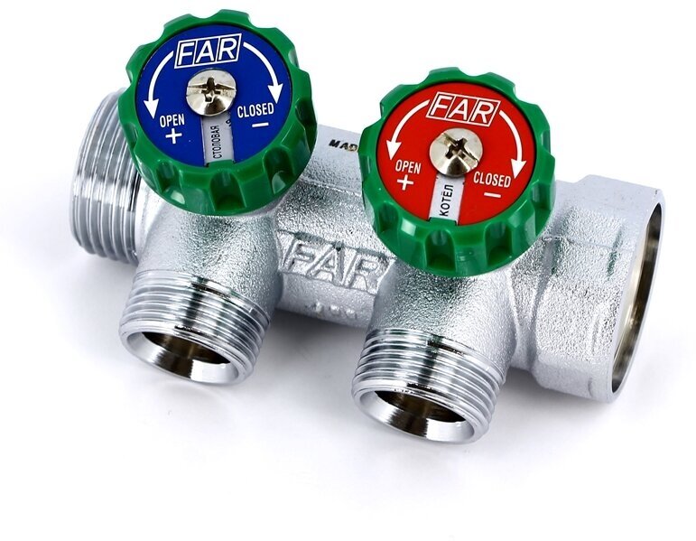 Коллектор FAR 3/4"х1/2" 2 выхода под конус хромированный с вентилями