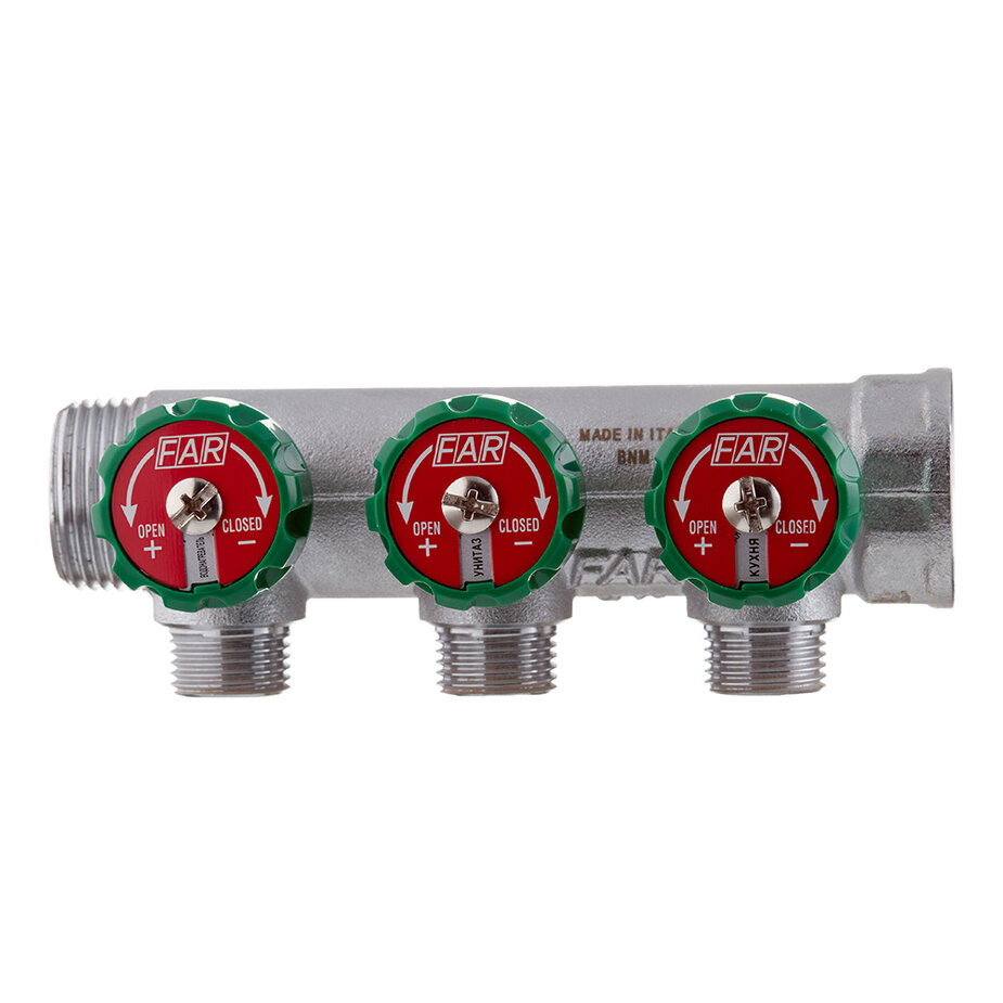 Коллектор FAR 3/4"х1/2" 3 выхода под конус хромированный с вентилями