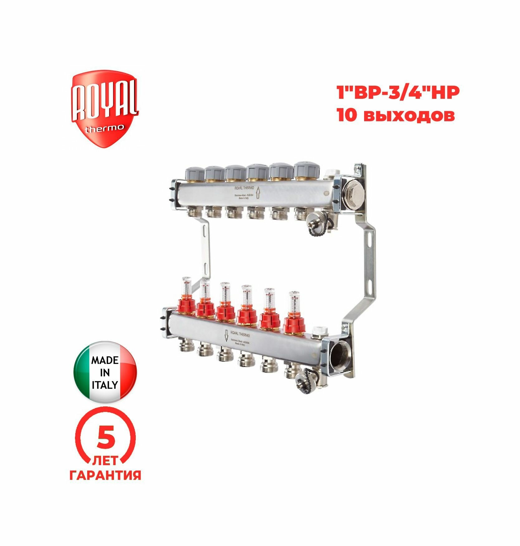 Коллектор нерж. в сборе с расходомерами 1" ВР-3/4" НР, 11 выходов Royal Thermo