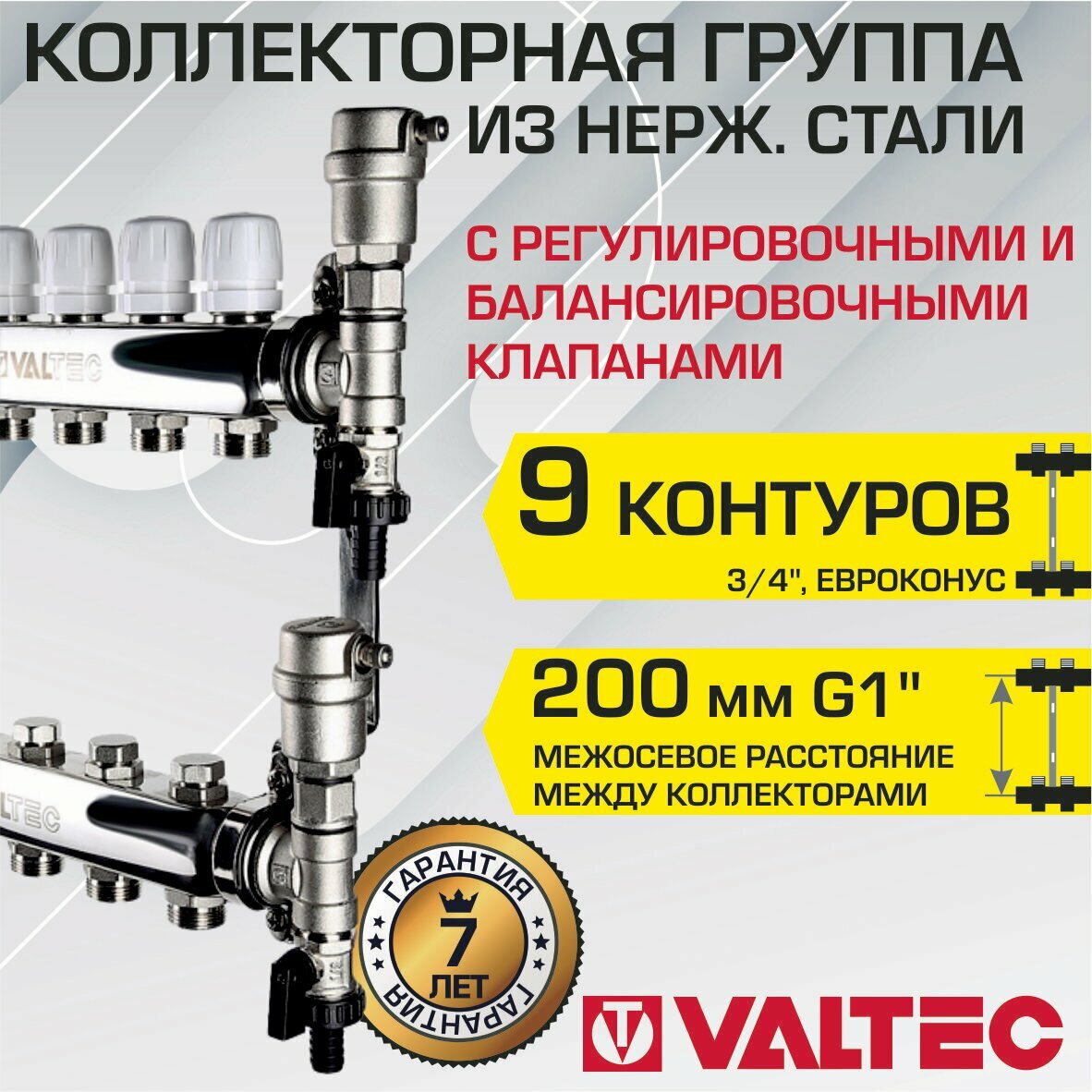 Коллектор нерж 1" х 9 вых. 3/4" Евроконус с регул. и балансир. клапанами VALTEC VTc.588.EMNX.0609