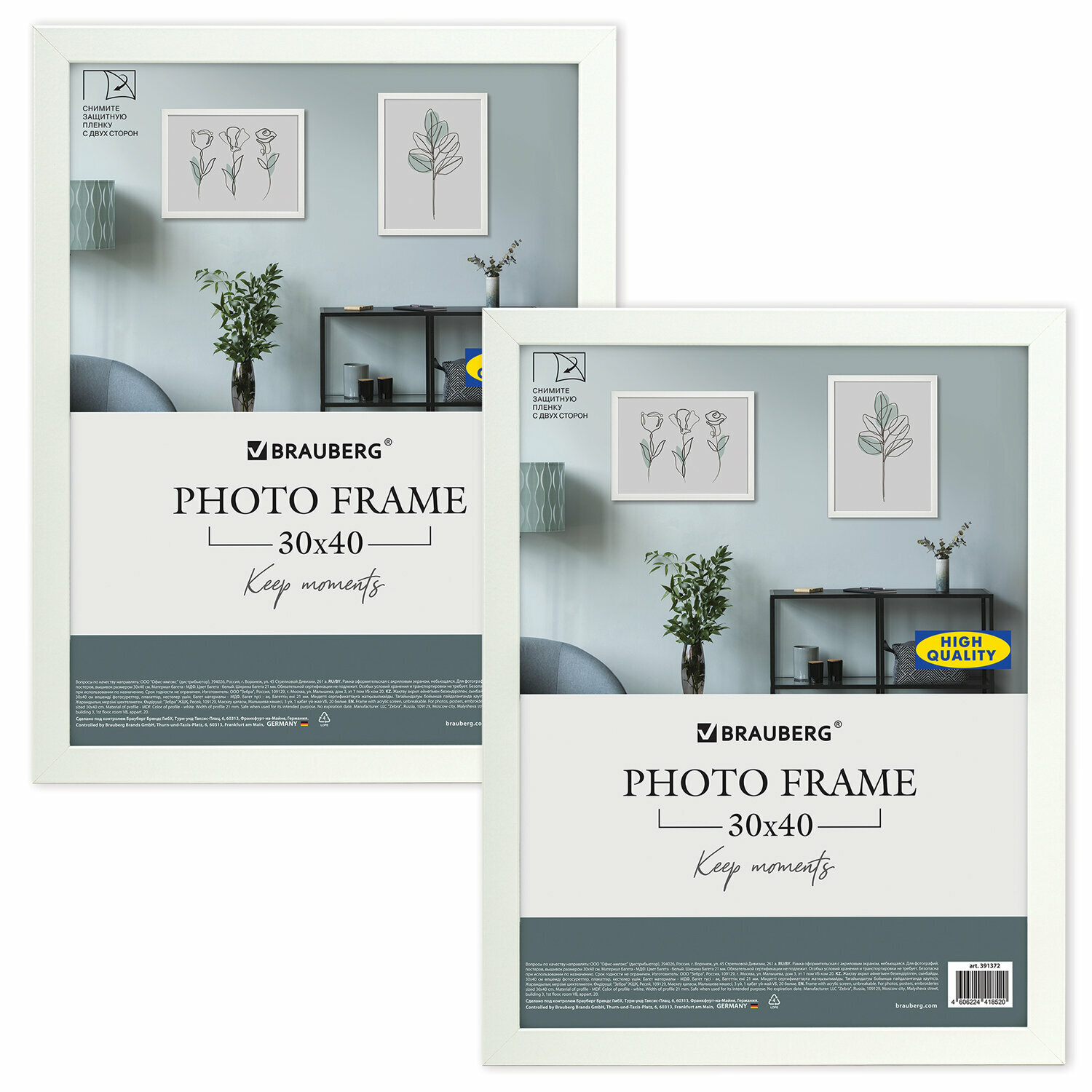 Рамка 30×40 см небьющаяся, комплект 2 штуки, багет 21 мм, МДФ, BRAUBERG «Idea», белая