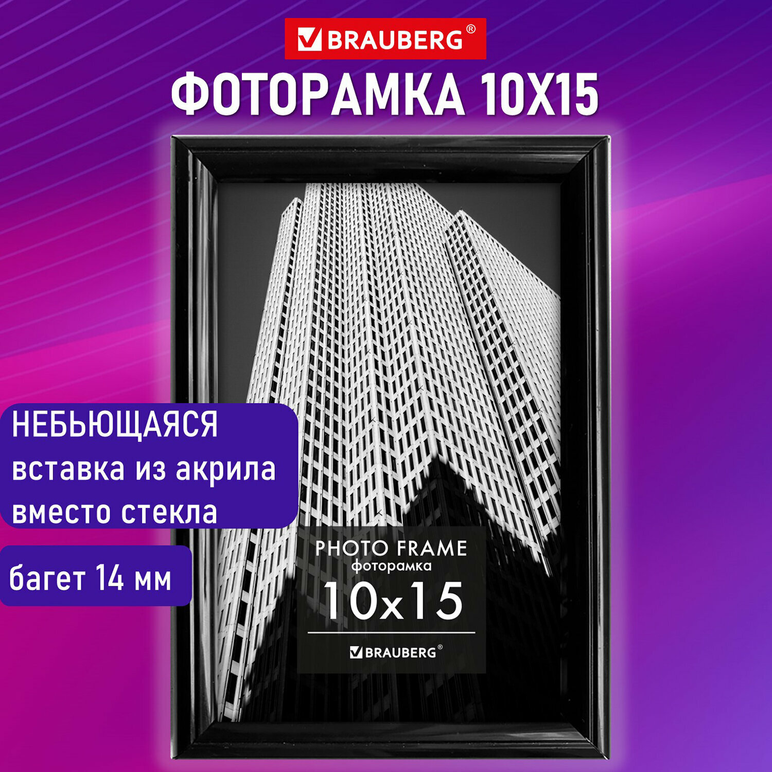 Купить Рамка 10х15 см небьющаяся, багет 14,6 мм, пластик, BRAUBERG "Original Line", черная/серебро, 391233 (391233)