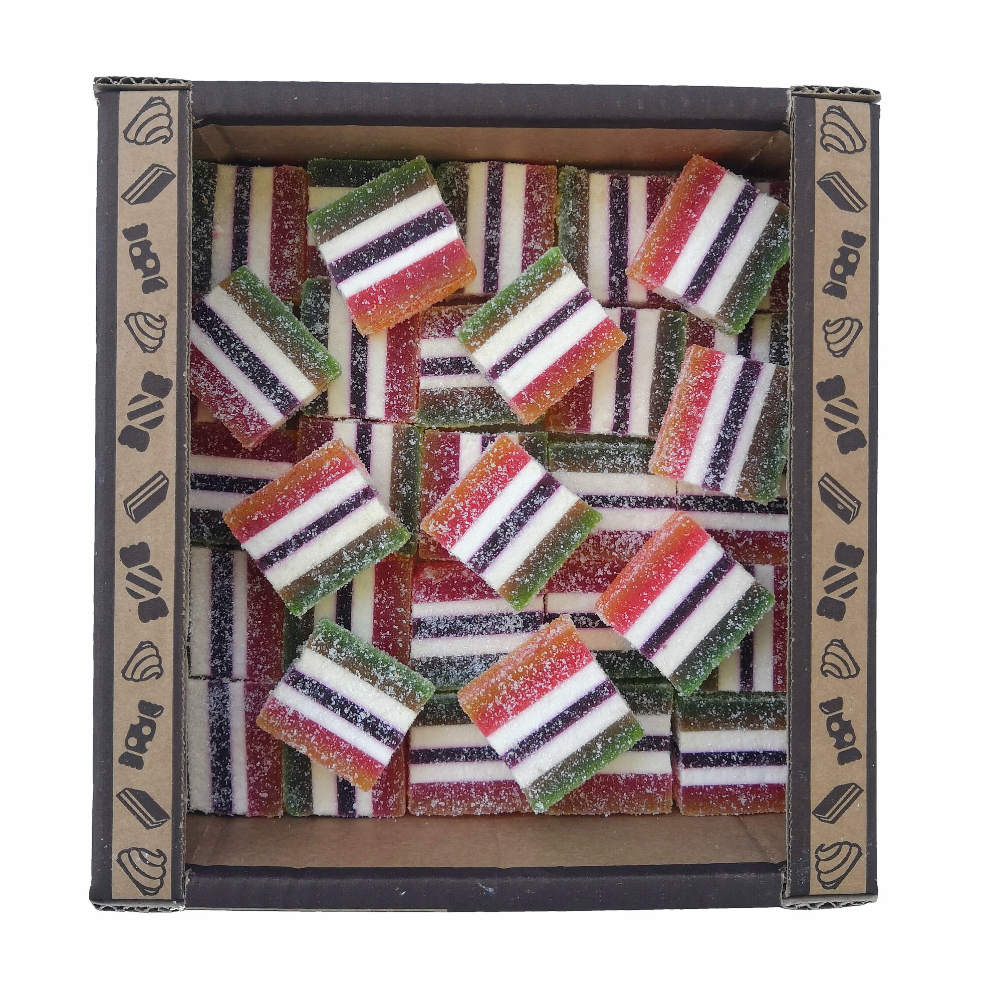 | Состав | Сахар, патока крахмальная, желирующий агент - агар, регулятор кислотности - лимонная кислота, сухой яичный белок, ароматизаторы пищевые, красители пищевые - "Аннато" , "Фруттокол желтый", " Биокол Хлорофилл ", " Черная смородина", "Фруттокол розовый" |