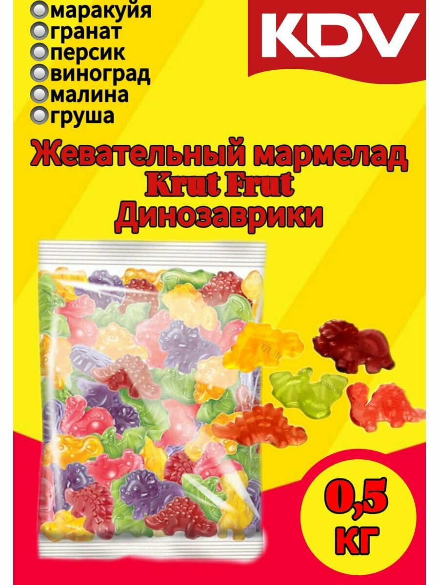 Жевательный мармелад КрутФрут Динозаврики со вкусом маракуйи, граната, персика, винограда, малины и груши KDV (КДВ), 500 г