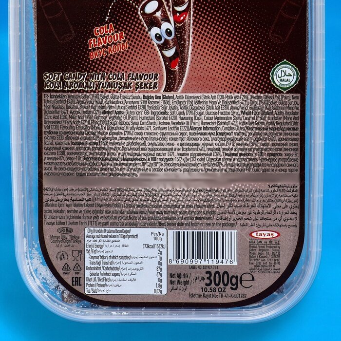 | Состав | Сахар, глюкозо-фруктозный сироп, пшеничная мука (клейковина), регулятор кислотности (лимонная кислота Е330, яблочная кислота Е296), декстроза, растительное масло (пальмовое), влагоудерживатель (сорбитол Е420), ароматизатор (кола), красители (сахарный колер IV Е150d), эмульгатор (моно- и диглицериды жирных кислот Е471), питательный скотовый желатин. |