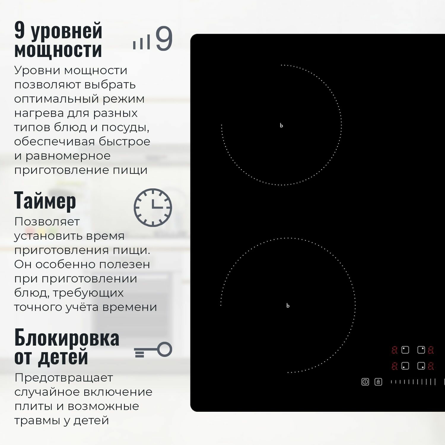| Безопасность | защитное отключение конфорок / кнопка блокировки панели / индикатор остаточного тепла |