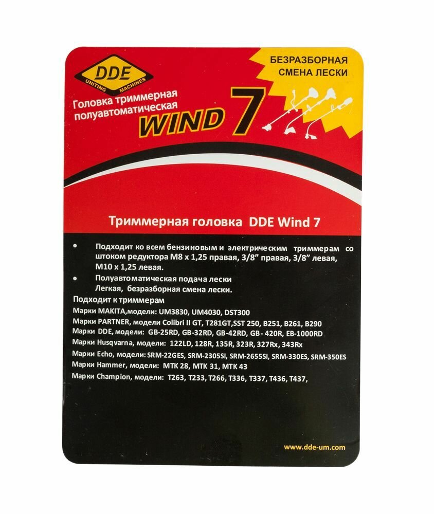 | Подробная комплектация | Головка триммерная DDE Wind 7 с леской, адаптеры 3/8" лев, 3/8" прав, M10*1,25 мм лев в блистере |