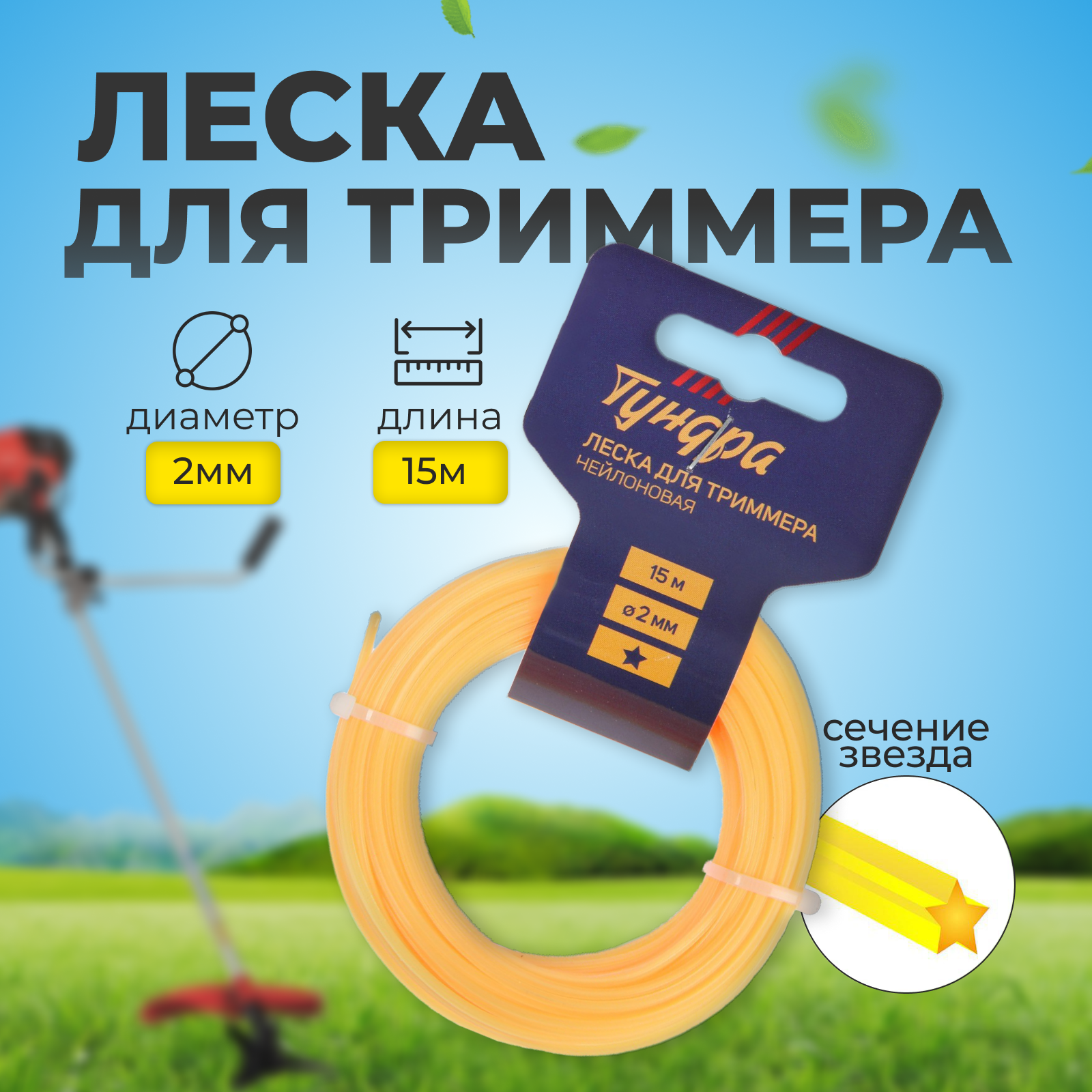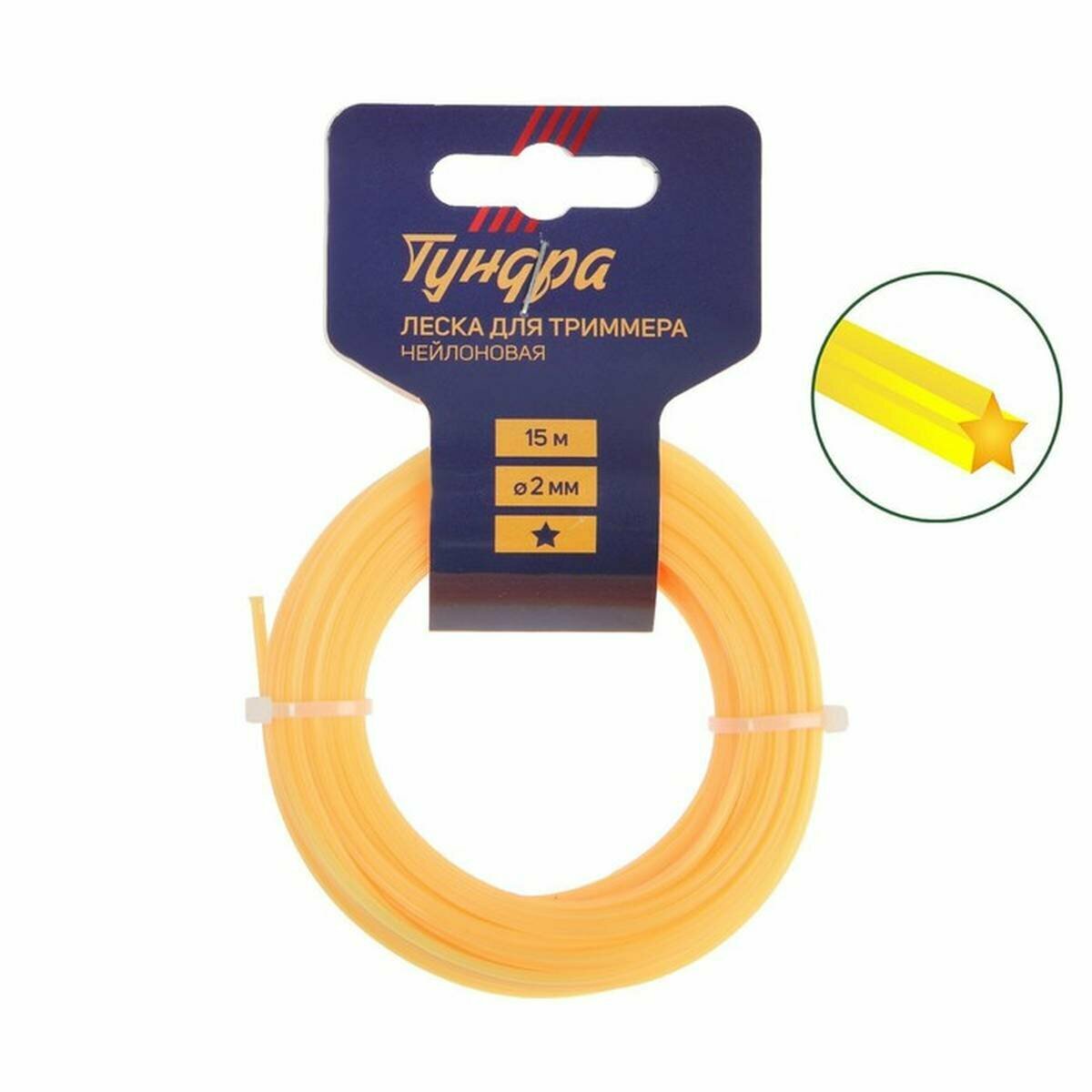 Леска для триммера тундра, сечение звезда, d=2 мм, 15 м, нейлон