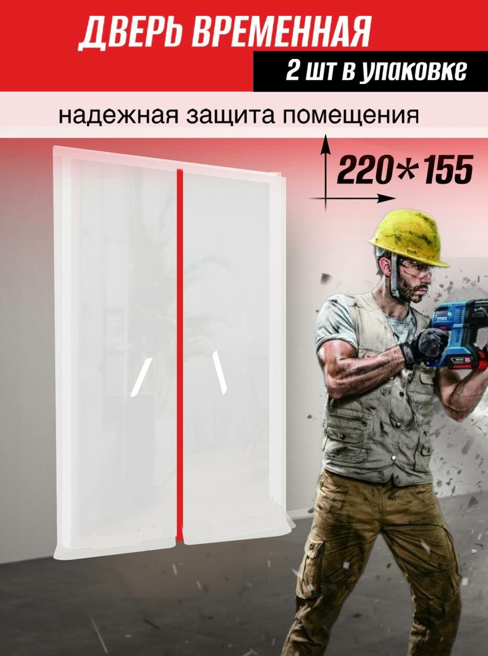 Временная пленочная дверь на молнии от пыли с красной молнией 220*155 1шт