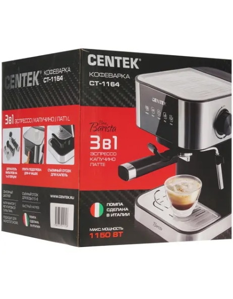 Кофеварка Centek CT-1164 <3в1> эспрессо 15 Бар +капучинатор +латте, 1500 мл, 1050Вт, сенсор, LED
