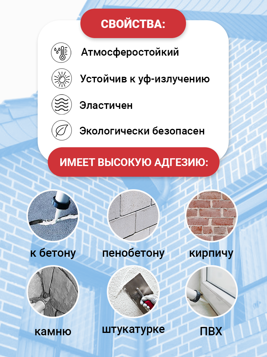 | Особенности | влагостойкость / возможность окрашивания / морозостойкий / термостойкий / устойчивый к УФ-излучению / эластичность |