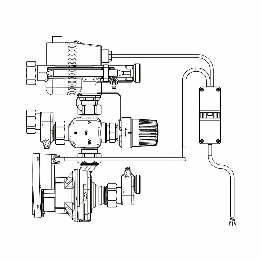 | Комплектация | Комплект поставки: 1 Смонтированная часть блока состоит из: – насоса – трехходового вентиля – тройника с обратным клапаном 2 Электрический накладной регулятор с кабелем, штекерным соединением и штекером для насоса. 3 Терморегулятор с накладным датчиком (диапазон настройки 20 - 50 °C) 4 Пружина для крепления электрического накладного регулятора 5 Плоские уплотнения 6 Хомут для крепления накладного датчика |