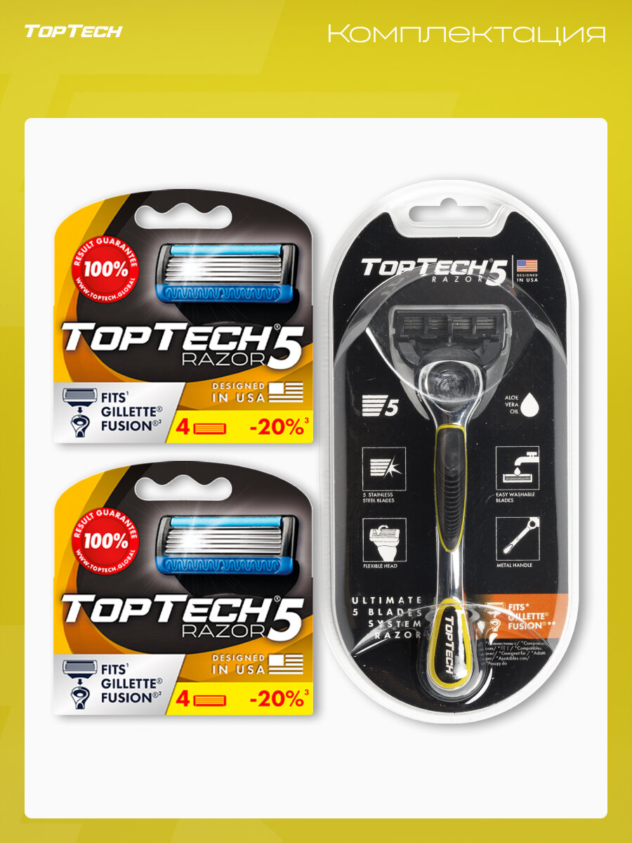 Сменные кассеты для бритья TopTech Razor 5. Совместимы с Gillette Fusion5. 4шт