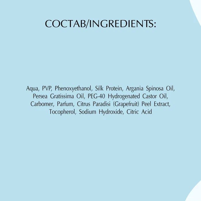 | Состав | Aqua, PVP, Phenoxyethanol, Silk Protein, Argania Spinosa Oil, Persea Gratissima Oil, PEG-40 Hydrogenated Castor Oil, Carbomer, Parfum, Citrus Paradisi (Grapefruit) Peel Extract, Tocopherol, Sodium Hydroxide, Citric Acid. |