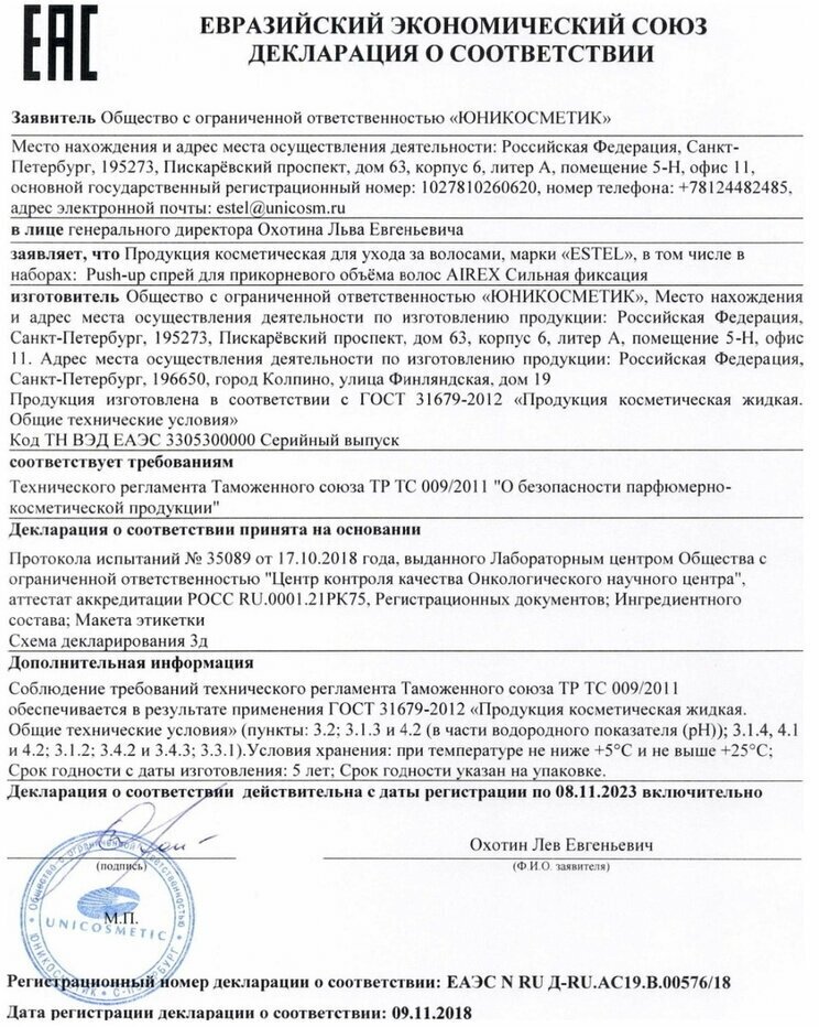 | Не содержит | минеральных масел / продуктов животного происхождения / формалина / формальдегид |