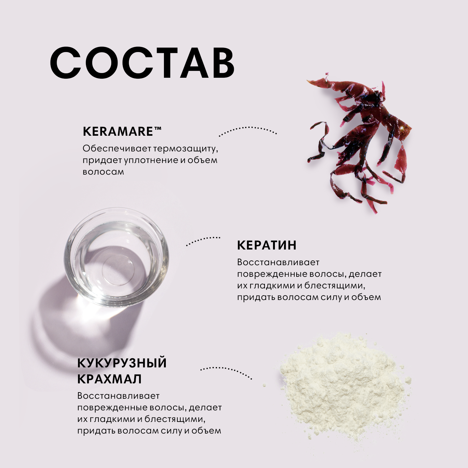 | Состав | Aqua (Water), Propylene Glycol, PEG-40 Hydrogenated Castor Oil, Polyvinyl Alcohol, Glycerin, Polyquaternium-7, Aloe Barbadensis Leaf Extract, Panthenol, Hydrolyzed Keratin, Cystoseira Compressa Extract, Disodium EDTA, Zea Mays (Corn) Starch, Isopropyl Alcohol, Fragrance (Parfum), Benzyl Alcohol, Dehydroacetic Acid, Sodium Benzoate, Gluconolactone, Calcium Gluconate, Phenoxyethanol, Ethylhexylglycerin. |