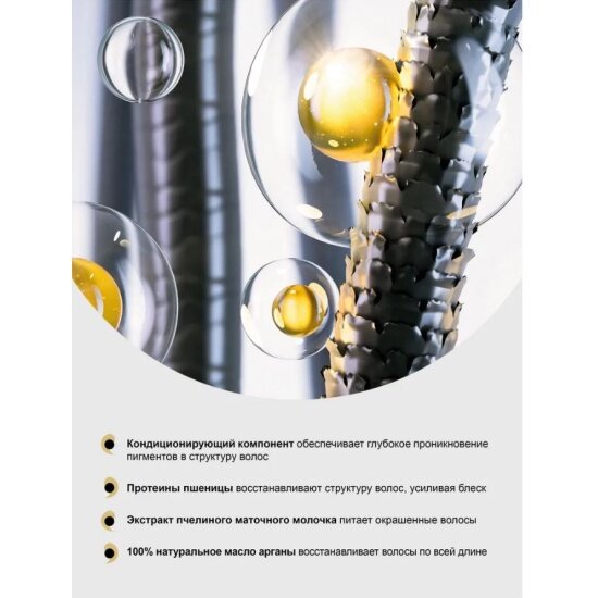 | Дополнительная информация | формула краски с кондиционирующим компонентом, содержит протеины пшеницы, экстракт пчелиного маточного молочка; состав: крем-краска 50 мл, окислитель 50 мл, бальзам "Закрепление цвета" 10 мл, перчатки пара (1 шт) |