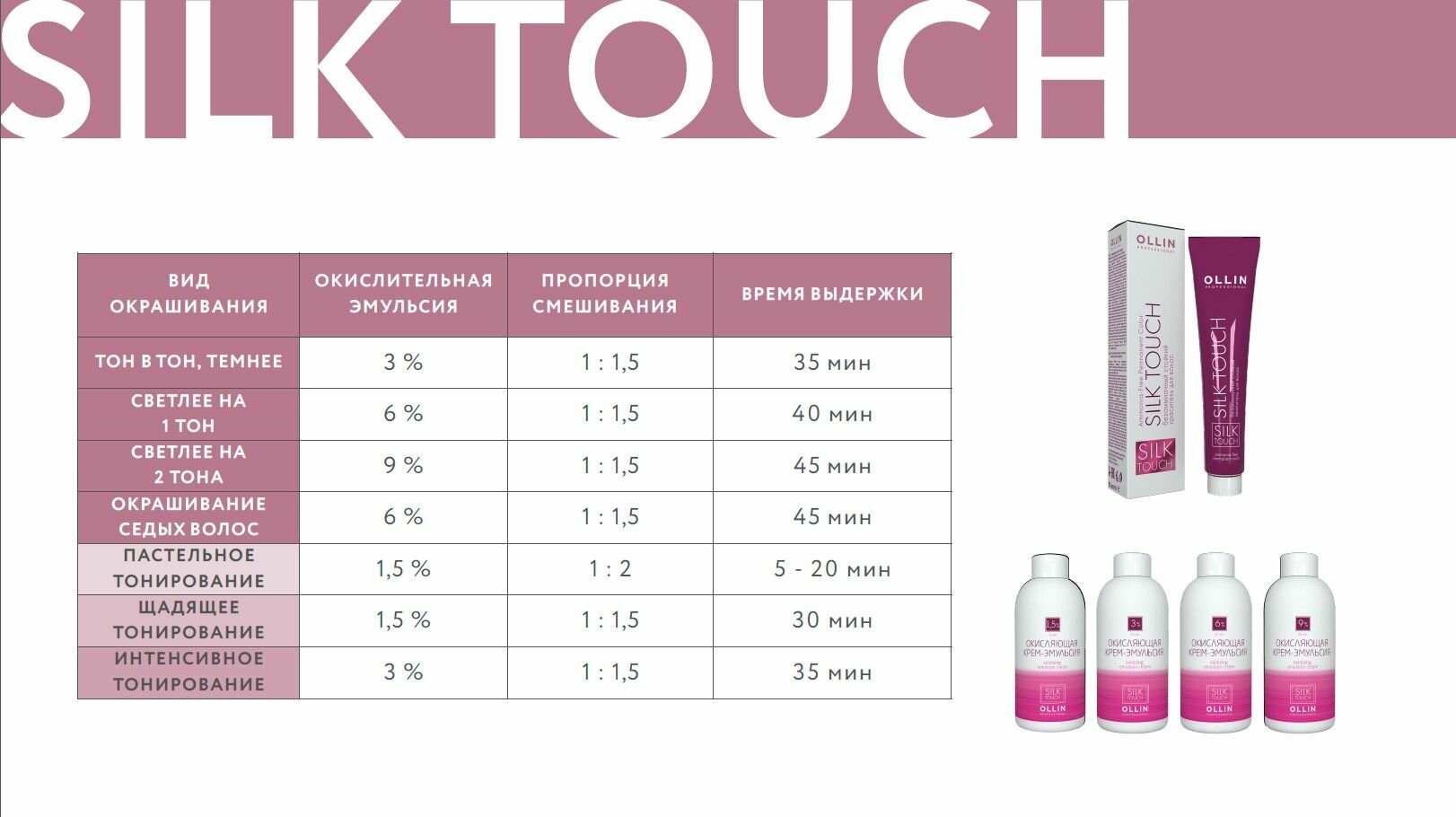 | Дополнительная информация | Серия Silk Touch; 1 часть красителя SILK TOUCH + 1,5 части окисляющей крем-эмульсии SILK TOUCH. Время выдержки зависит от выбора окисляющей крем-эмульсии от 35 до 45 минут; |