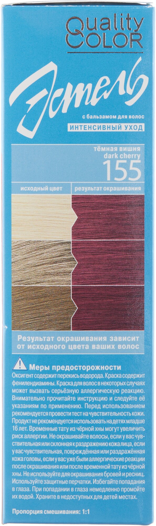 | Состав | Aqua, Sodium Laureth Sulfate, Cocamide DEA, Ammonium Carbonate, p-Phenylenediamine, PVP, Panthenol, Ethylpantenol, Nicotineamid, Ascorbic Acid, Sodium Ascorbate, Sodium Salicylate, Sodium Sulfite, Sodium Erythorbate, m-Aminophenol, Resorcinol, 2-Amino-4-Hydroxyethylaminoanisol Sulfate, 2,6-Diaminopyridine, Parfum, alpha-Isomethyl Ionone, Butylphenyl Methylpropional, Tetrasodium EDTA, Sodium Hydrosulfite. |