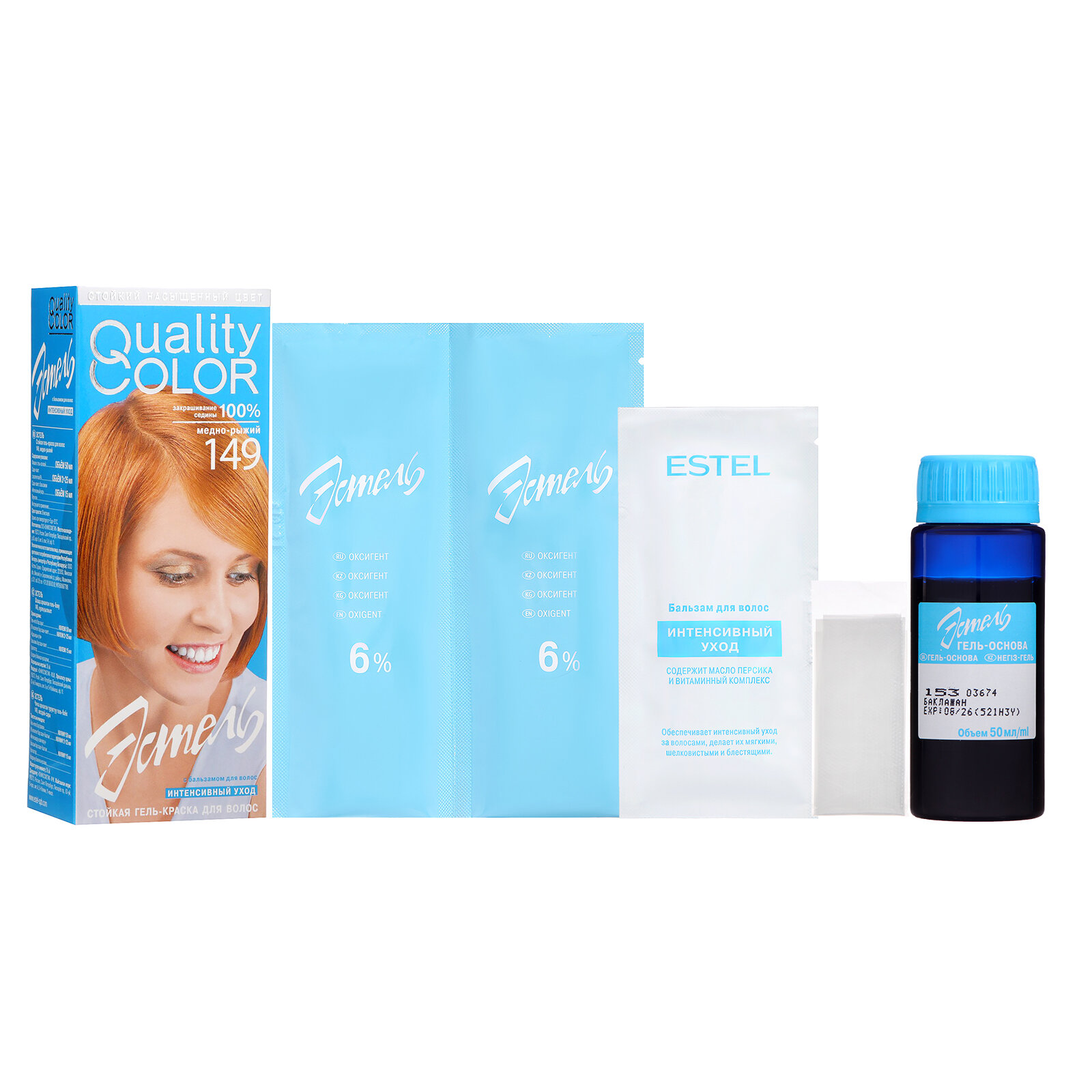 | Комплектация | - флакон с гель-основой, 50 мл; - саше-пакет с оксигентом 6%, 2х25 мл; - саше-пакет с бальзамом "Интенсивный уход", 15 мл; - перчатки; - инструкция по применению. |