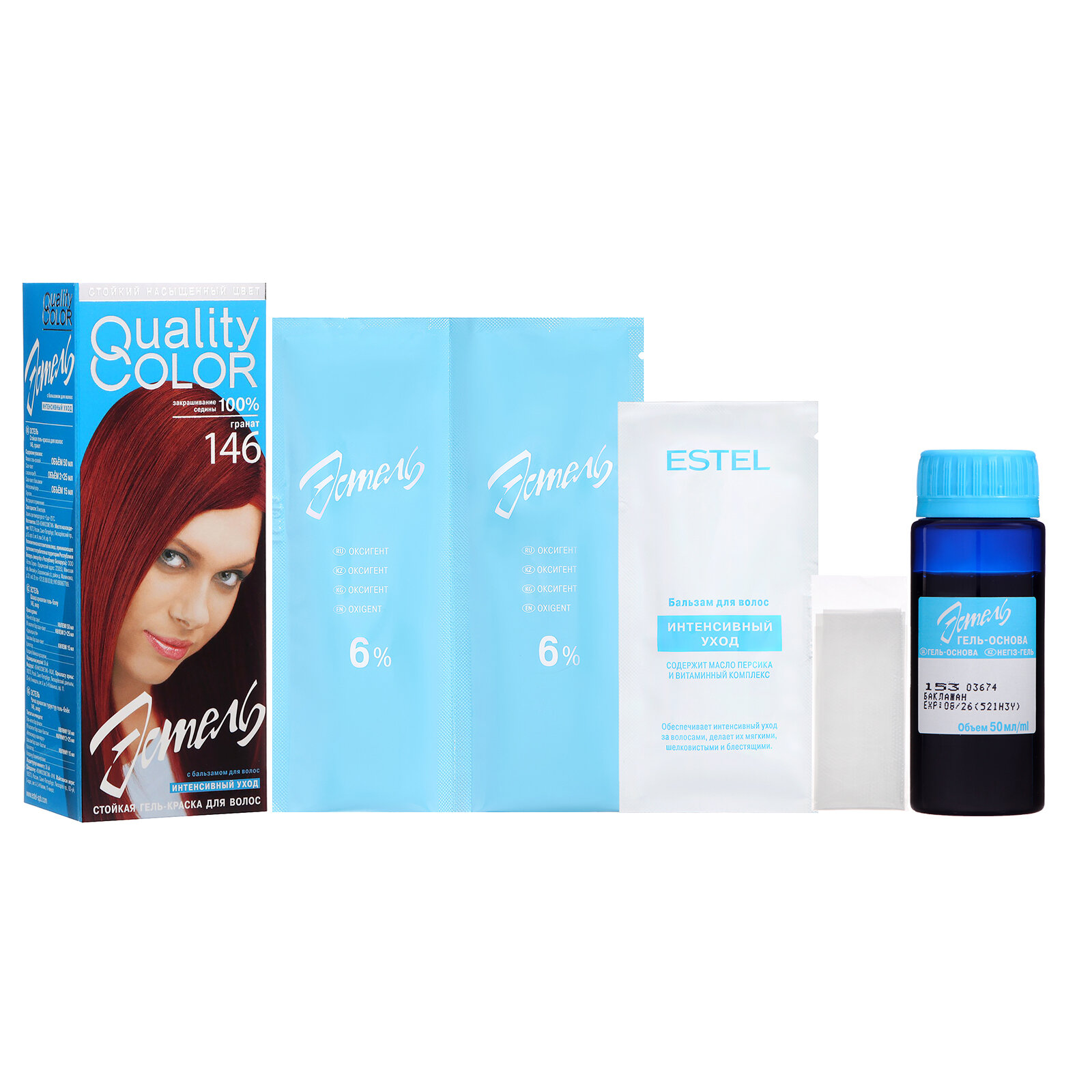 | Комплектация | - флакон с гель-основой, 50 мл; - саше-пакет с оксигентом 6%, 2х25 мл; - саше-пакет с бальзамом "Интенсивный уход", 15 мл; - перчатки; - инструкция по применению. |
