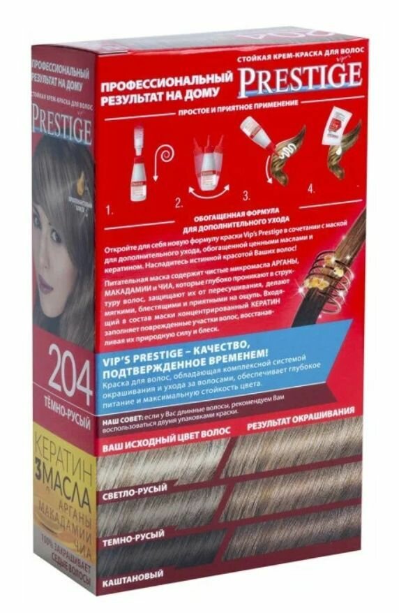 Ниже Вы можете прочитать отзывы на VIP's Prestige Бриллиантовый блеск стойкая крем-краска для волос, 204 - темно-русый, ознакомится с подробными характеристиками, посмотреть интересные обзоры и фотографии на VIP's Prestige Бриллиантовый блеск стойкая крем-краска для волос, 204 - темно-русый.