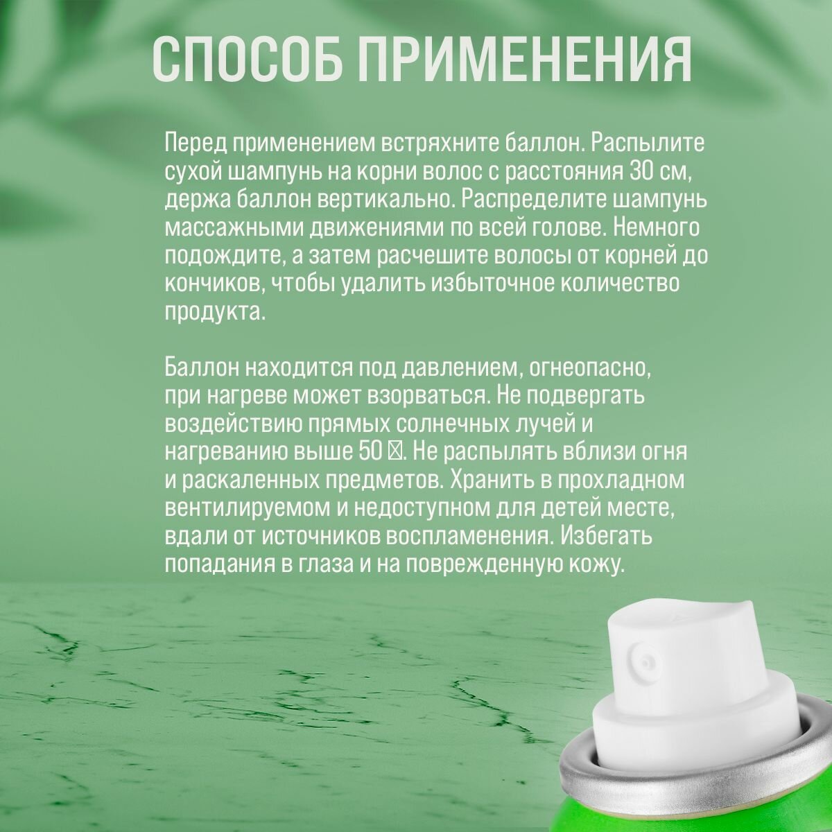 | Способ применения | перед применением встряхните баллон. Распылите сухой шампунь на корни волос с расстояния 30 см, держа баллон вертикально. Распределите шампунь массажными движениями по всей голове. Немного подождите, а затем расчешите волосы от корней до кончиков, чтобы удалить избыточное количество продукта |