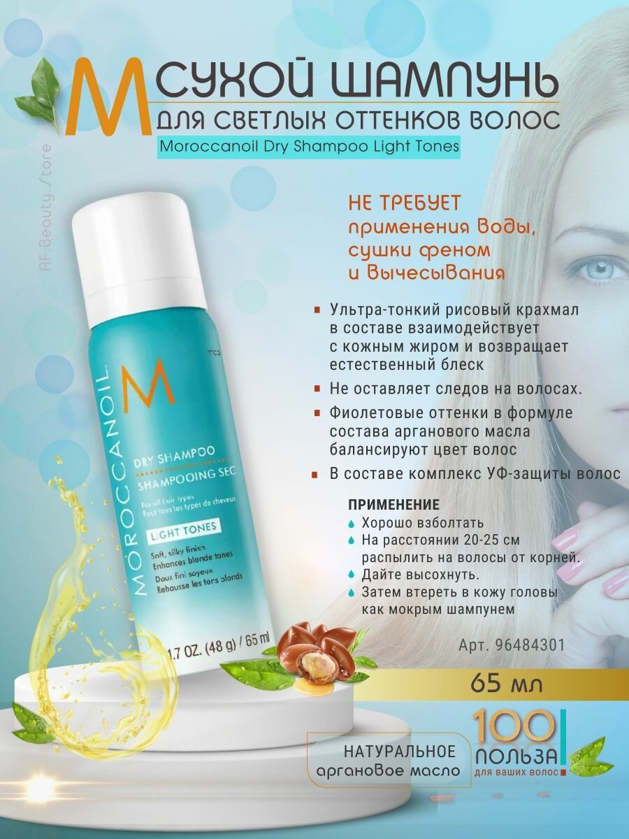 | Способ применения | хорошо встряхните флакон. Распылите сухой шампунь Moroccanoil на сухие корни с расстояния 15–20 см. Дайте волосам подсохнуть, затем вотрите вещество в кожу головы, как с жидким шампунем. Расчешите волосы |