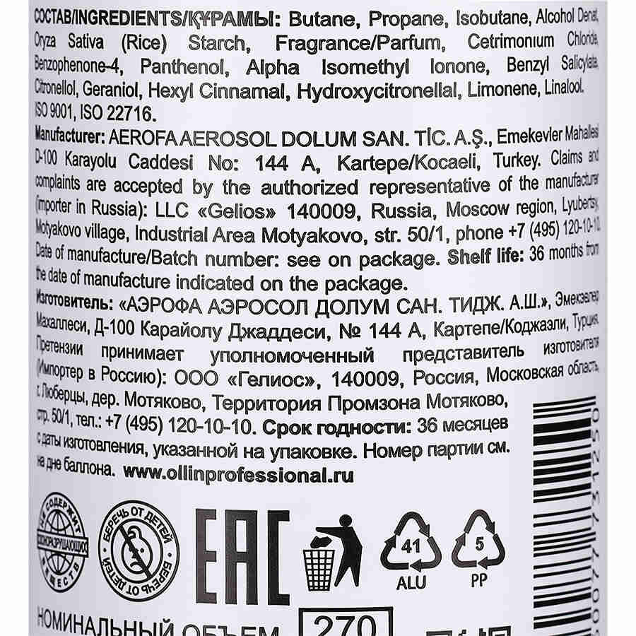 | Состав | Butane, Propane, Isobutane, Alcohol Denat, Oryza Sativa (Rice) Starch, Fragrance/Parfum, Cetrimonıum Chloride, Benzophenone-4, Panthenol, Alpha Isomethyl Ionone, Benzyl Salicylate, Citronellol, Geraniol, Hexyl Cinnamal, Hydroxycitronellal, Linalool, ISO 9001, ISO 22716. |