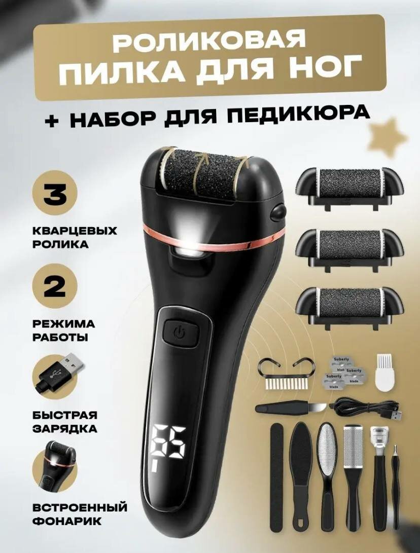 Электрическая пилка для пяток с дисплеем, подсветкой. Профессиональный набор роликовая пилка с аксессуарами для педикюра.
