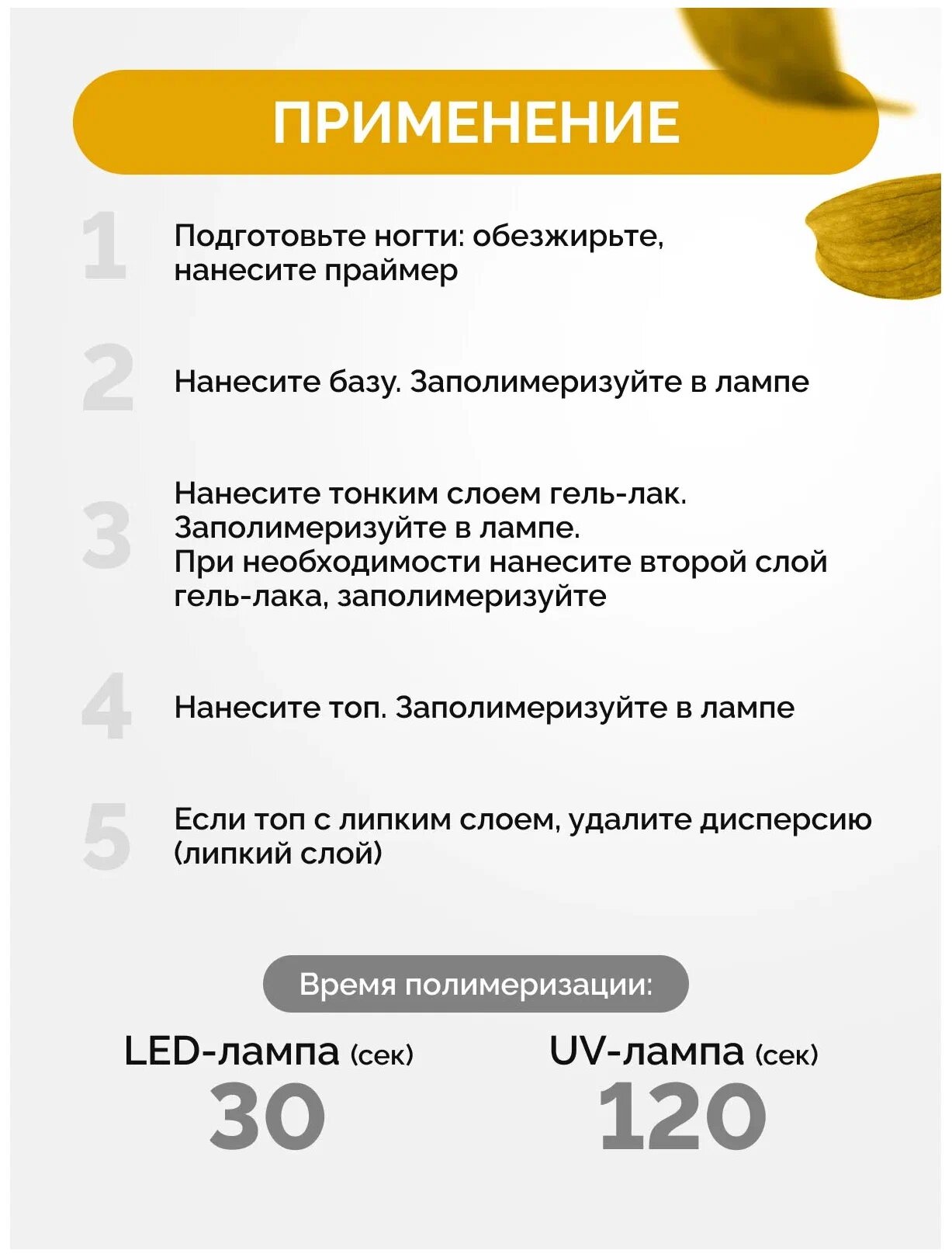 | Способ применения | Нанесение топа – завершающий этап маникюра. Рекомендованное время полимеризации в UV-лампе – 2 мин., в LED-лампе – 60 сек. Не требует снятия дисперсионного слоя. |