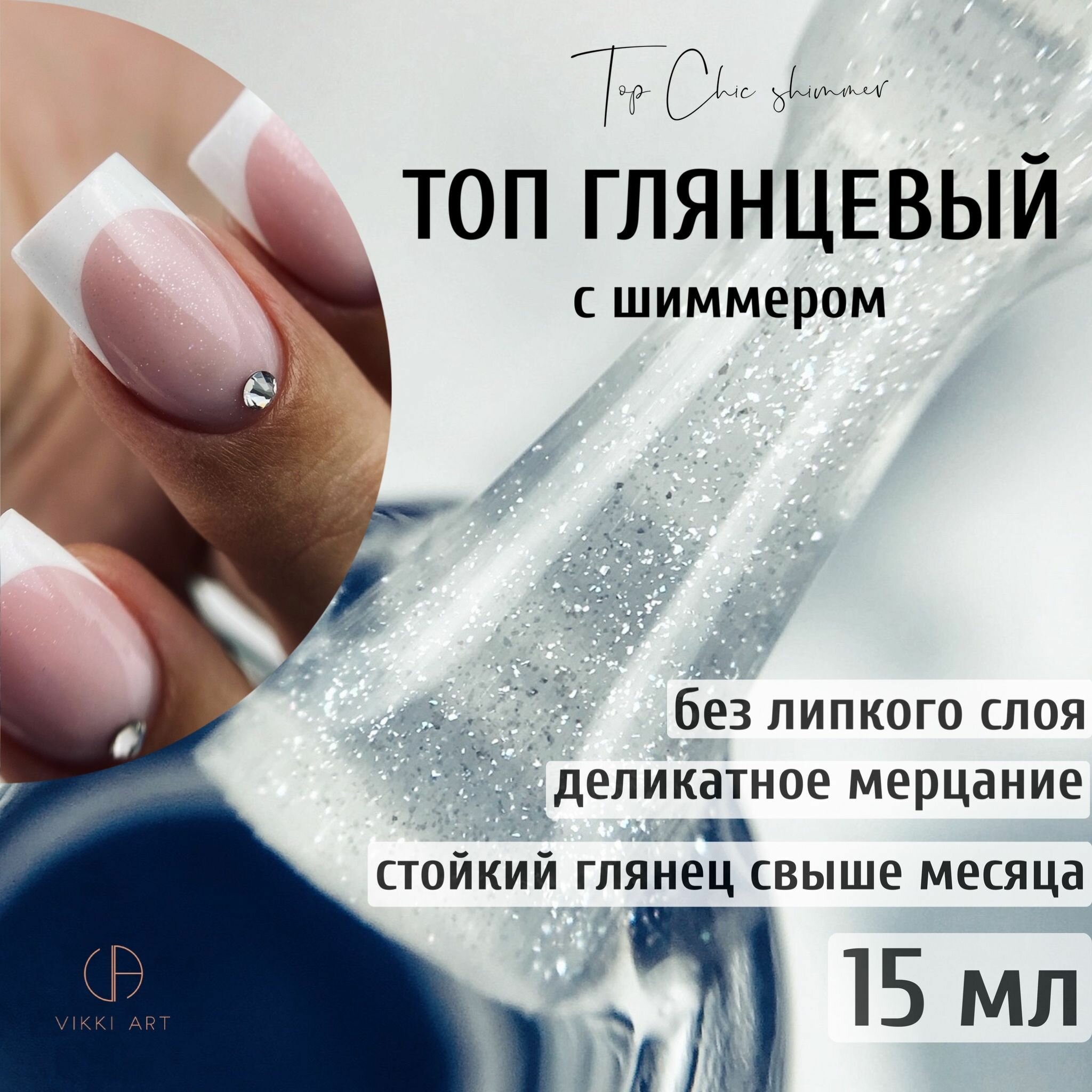 VIKKIART Top Chic, 15мл / Топ для гель лака глянцевый без липкого слоя, стойкий с зеркальным блеском для создания идеальных бликов