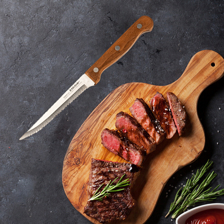 | Отзыв: | Хороший нож, стейк режет хорошо. В комплект к деревянной доске для подачи стейка хорошо подходит. |
