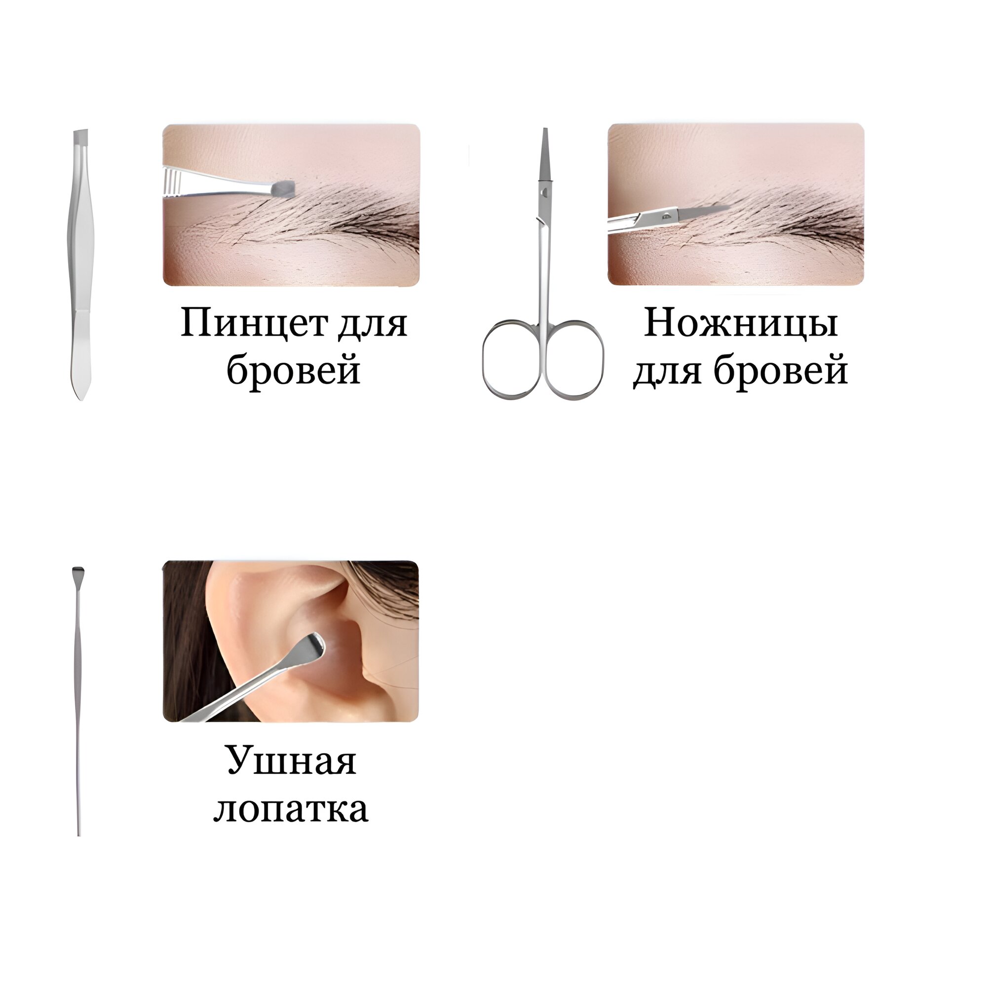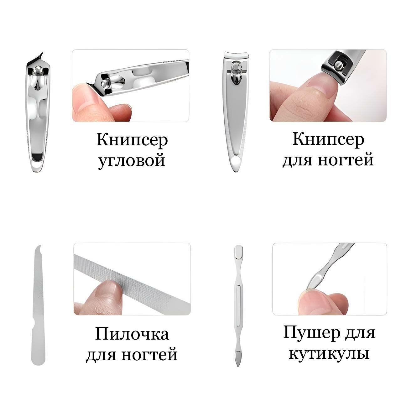| Состав набора | кусачки для маникюра, кусачки для педикюра, ножницы для ногтей, пилка, пинцет, пушер для кутикулы |