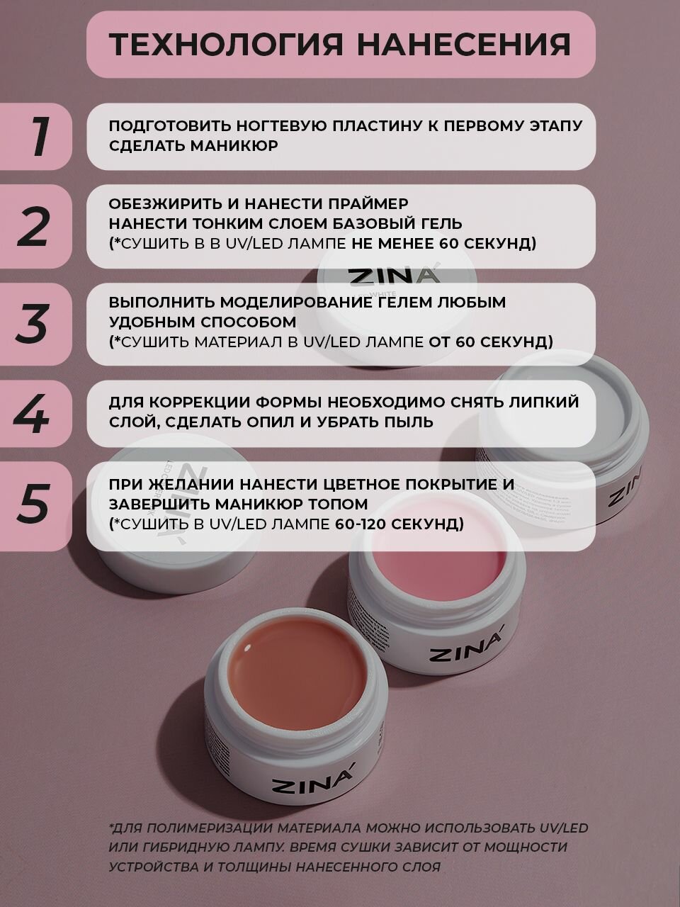 | Способ применения | равномерно распределить гель по ногтевой пластине, сушить в LED лампе (не менее 36W) 30-60 секунд в зависимости от мощности устройства и толщины слоя. Обратите внимание, что все гели серии LED необходимо хранить как можно дальше от источников света. *Для лучшей сцепки с натуральным ногтем рекомендуем наносить гель на подложку из базы. |