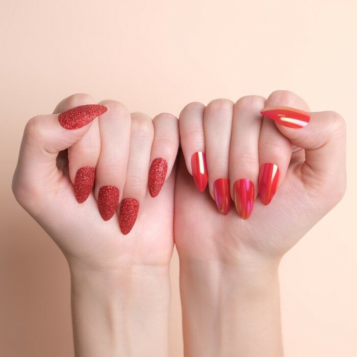 Купить Накладные ногти, 24 шт, с клеевыми пластинами, форма миндаль, блёстки/голография, цвет красный