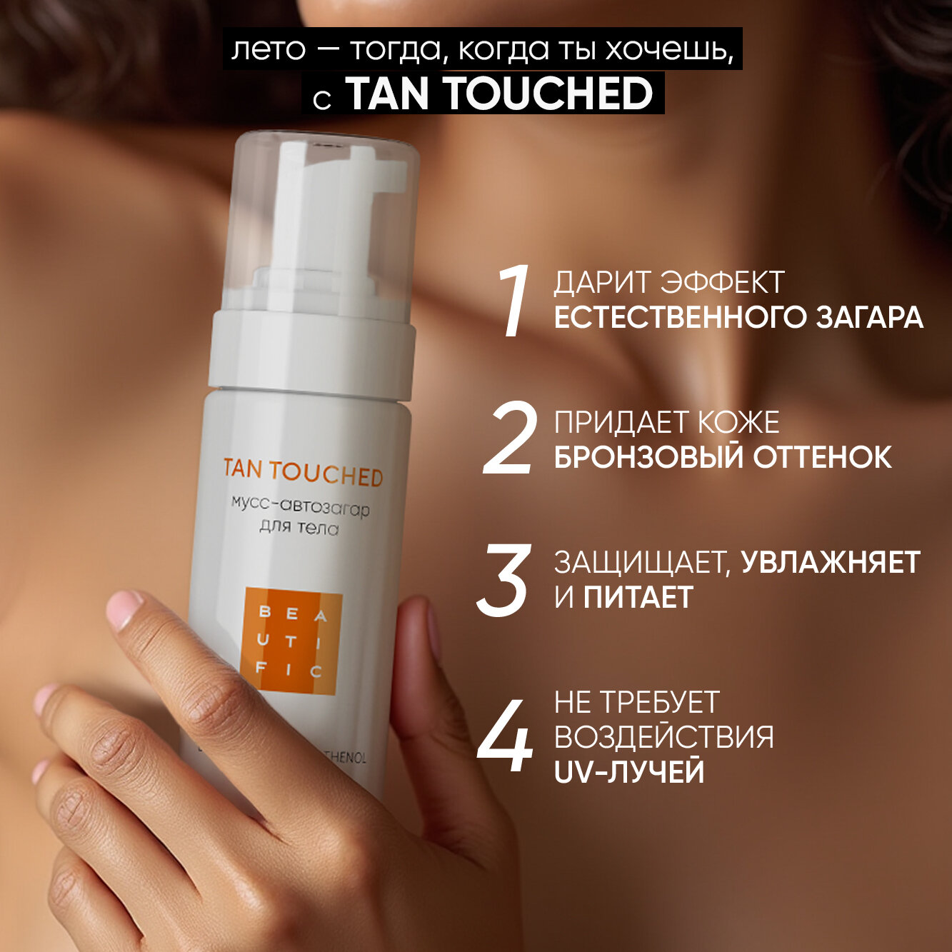 BEAUTIFIC Автозагар для тела TAN TOUCHED оттенок Medium для светлой кожи с эритрулозой и пантенолом, бронзатор для тела, мусс автозагар, 150 мл интересное: