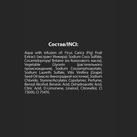 | Состав | Aqua with infusion of: Ficus Carica (Fig) Fruit Extract (экстракт Инжира); Sodium Coco Sulfate, Cocamidopropyl Betaine (из Кокосового масла), Vegetable Glycerin (растительного происхождения), Sodium Cocoamphoacetate, Sodium Laureth Sulfate, Vitis Vinifera (Grape) Seed Oil (масло Виноградной косточки), Sodium Chloride, Styrene/Acrylates Copolymer, Perfume, Benzyl Alcohol, Benzoic Acid, Dehydroacetic Acid, Citric Acid, D-Limonene, Linalool, Citronellol, Cl 73000, CI 75470 |