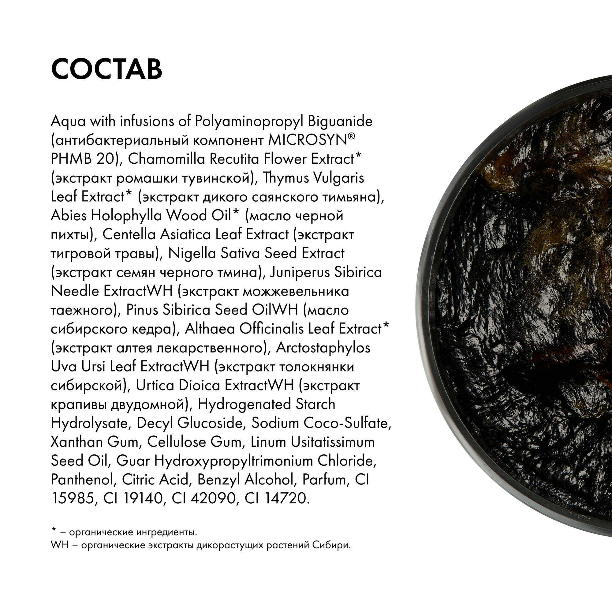 | Состав | Aqua with infusions of Polyaminopropyl Biguanide (антибактериальный компонент MICROSYN® PHMB 20) Chamomilla Recutita Flower Extract* (экстракт ромашки тувинской) Thymus Vulgaris Leaf Extract* (экстракт дикого саянского тимьяна) Abies Holophylla Wood Oil* (масло черной пихты) Centella Asiatica Leaf Extract (экстракт тигровой травы) Nigella Sativa Seed Extract (экстракт семян черного тмина) Juniperus Sibirica Needle ExtractWH (экстракт можжевельника таежного) Pinus Sibirica Seed OilWH (масло сибирского кедра) Althaea Officinalis Leaf Extract* (экстракт алтея лекарственного) Arctostaphylos Uva Ursi Leaf ExtractWH (экстракт толокнянки сибирской) Urtica Dioica ExtractWH (экстракт крапивы двудомной) Hydrogenated Starch Hydrolysate Decyl Glucoside Sodium Coco-Sulfate Xanthan Gum Cellulose Gum Linum Usitatissimum Seed Oil Guar Hydroxypropyltrimonium Chloride Panthenol Citric Acid Benzyl Alcohol Parfum CI 15985 CI 19140 CI 42090 CI 14720 |