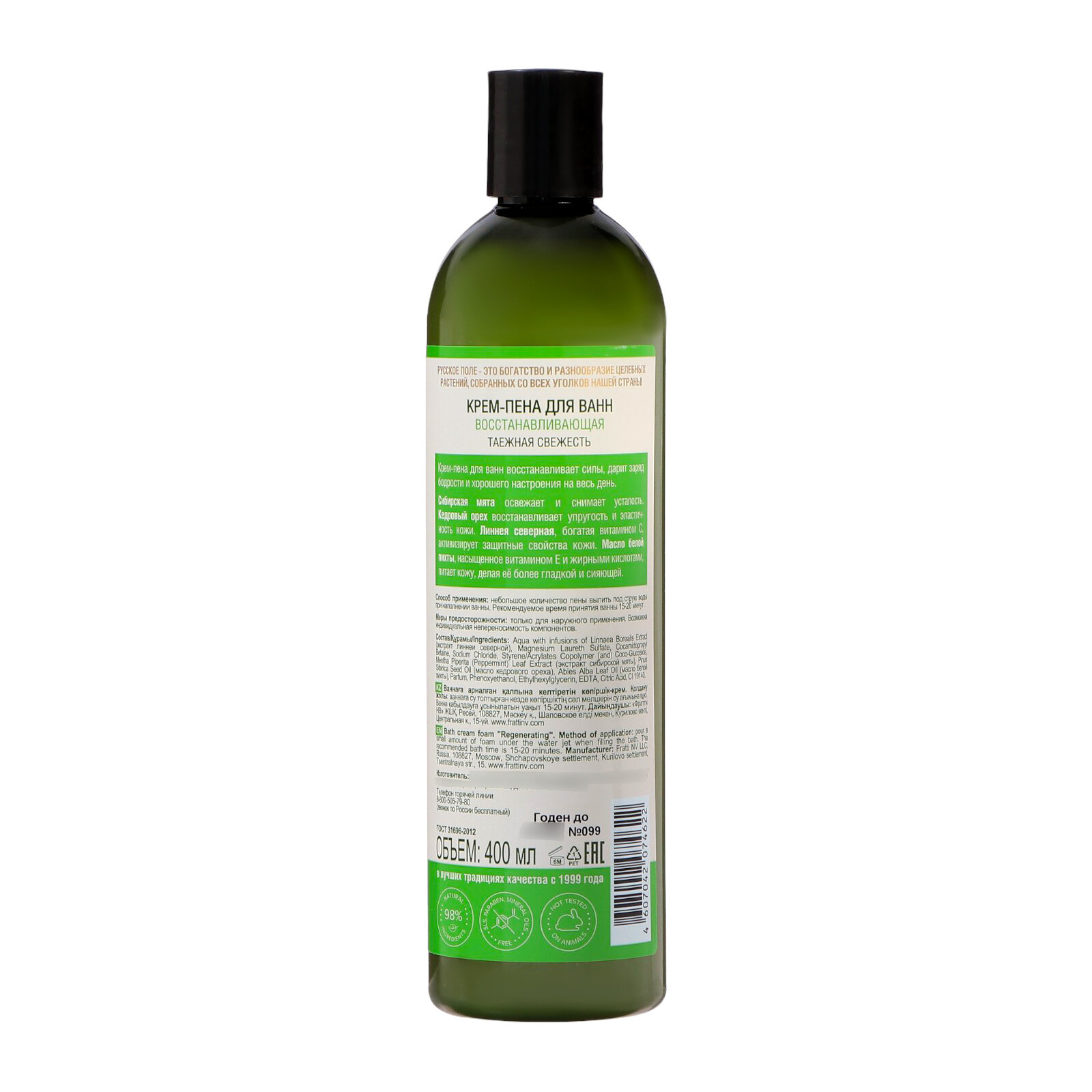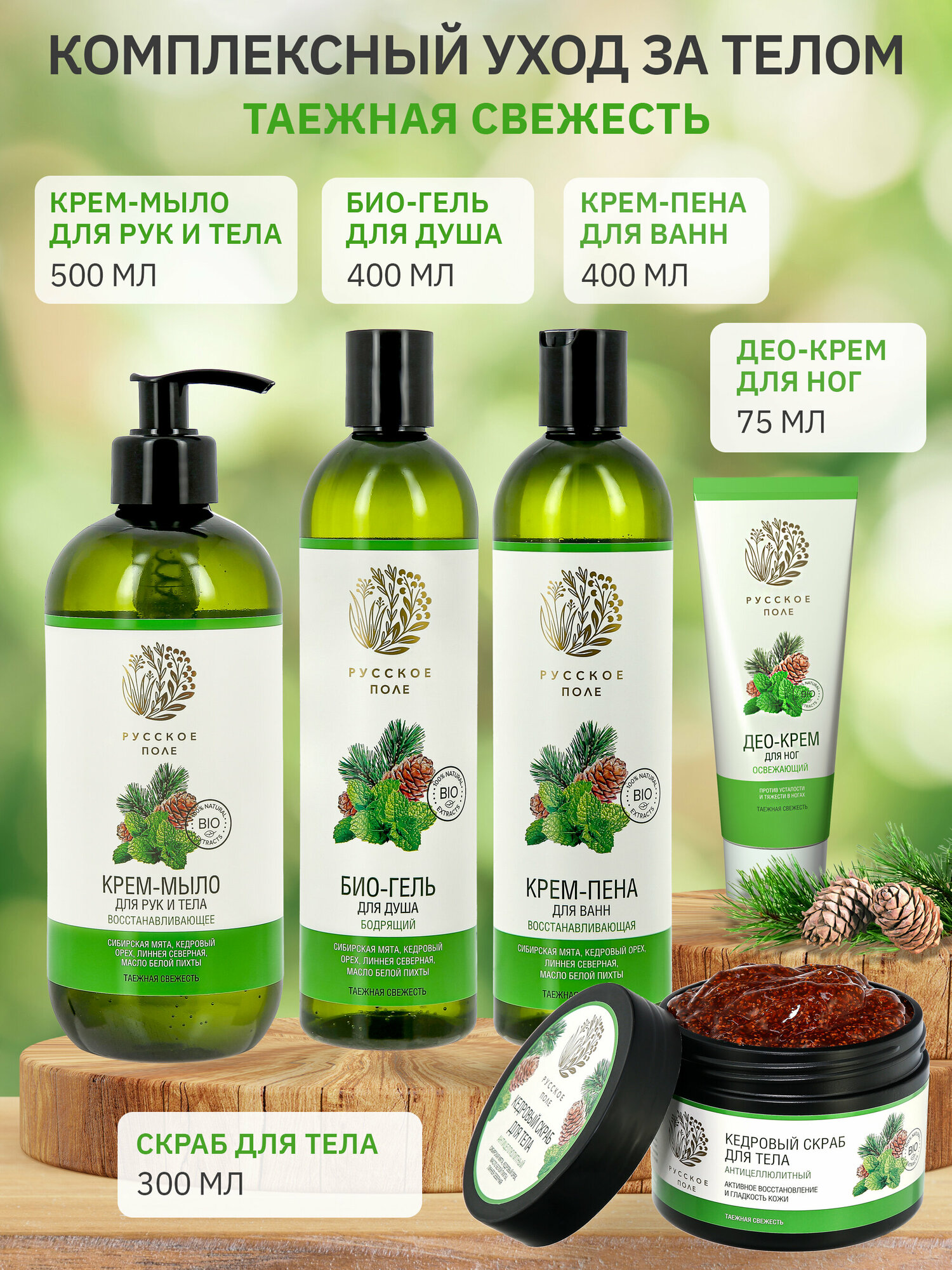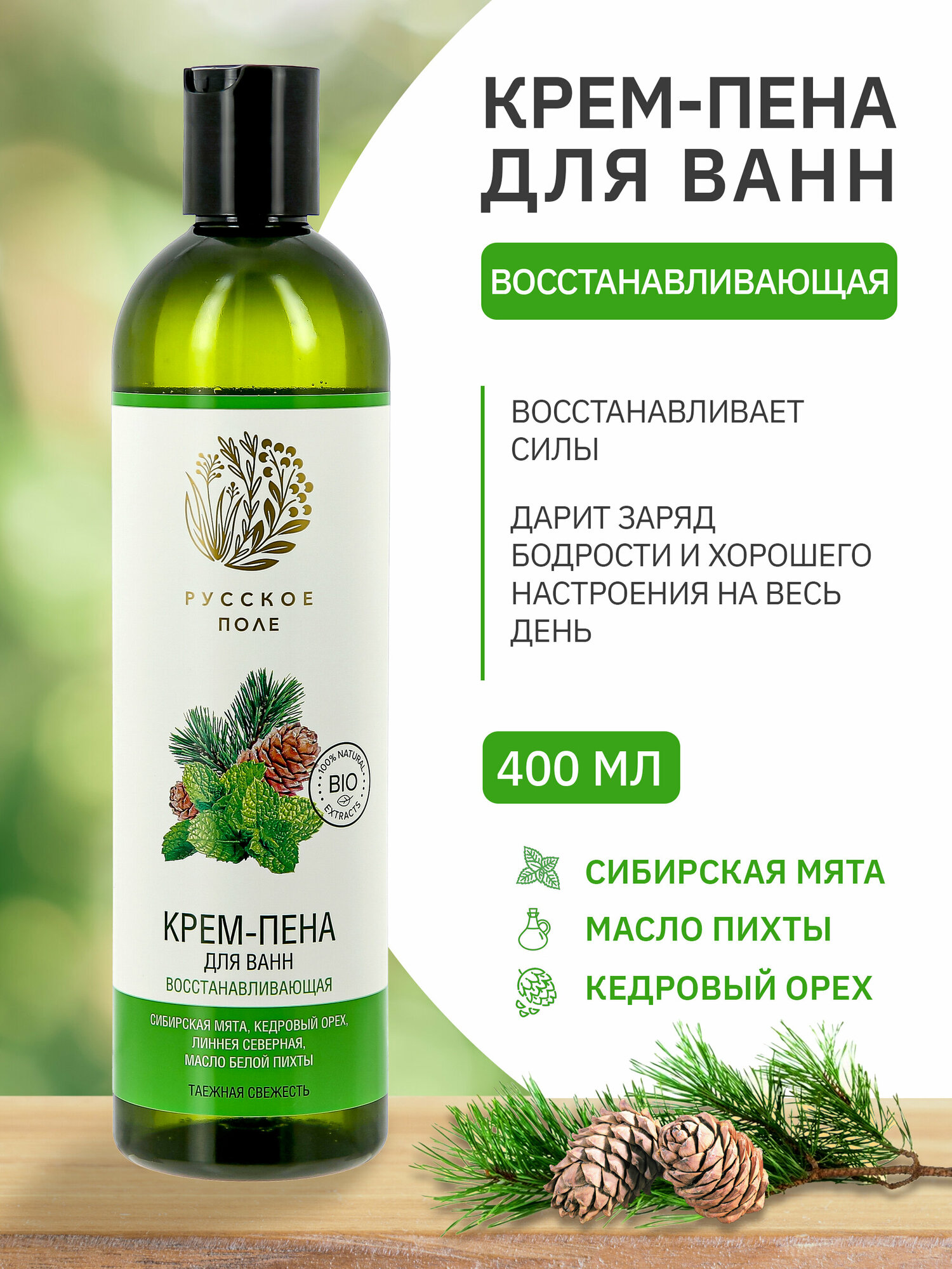 | Состав | Aqua with infusions of Linnaea Borealis Extract (экстракт линнеи северной), Magnesium Laureth Sulfate, Cocamidopropyl Betaine, Sodium Chloride, Styrene/Acrylates Copolymer (and) Coco-Glucoside, Mentha Piperita (Peppermint) Leaf Extract (экстракт сибирской мяты), Pinus Sibirica Seed Oil (масло кедрового ореха), Abies Alba Leaf Oil (масло белой пихты), Parfum, Phenoxyethanol, Ethylhexylglycerin, EDTA, Citric Acid, CI 19140. |