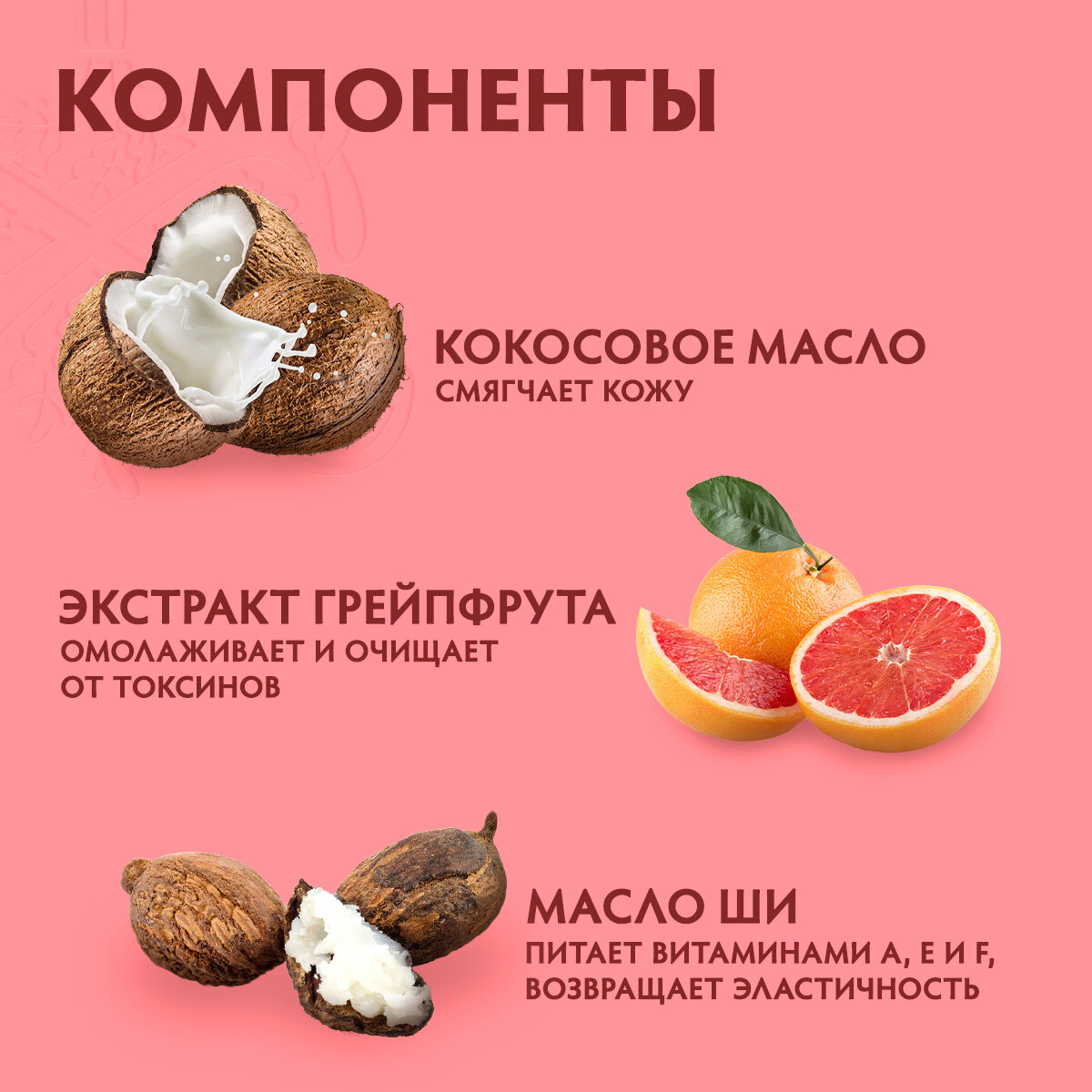 | Масла и экстракты | кокосовое масло / масло виноградной косточки / масло соевое / масло ши (карите) / оливковое масло / эссенция грейпфрута |