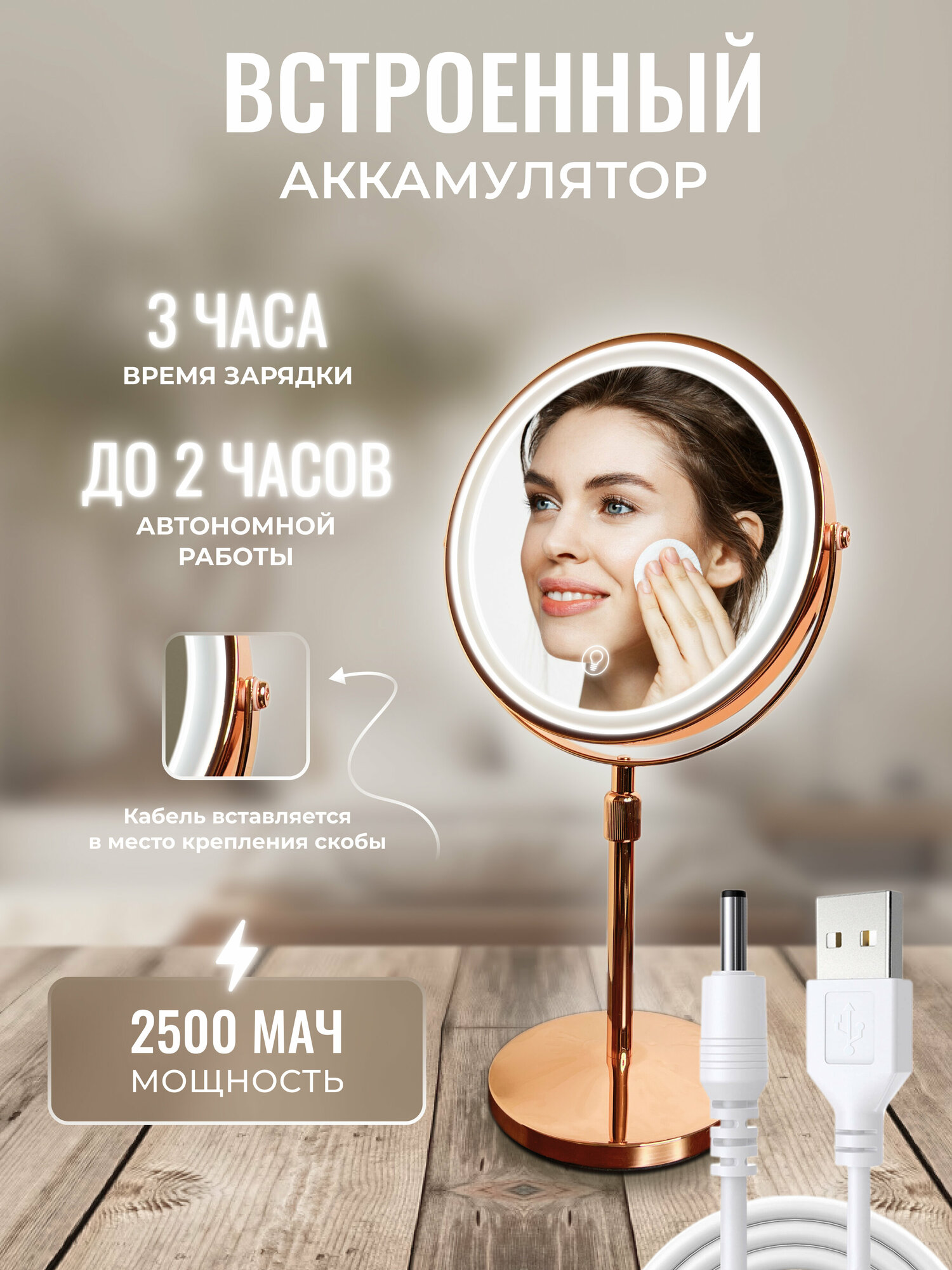 | Комплектация | Двустороннее зеркало, подставка, кабель USB, салфетка из микрофибры |