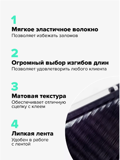 | Дополнительная информация | Поместите линию ресниц на планшет и подготовьте клей для наращивания ресниц. С помощью пинцета снимите ресницу или пучок с ленты, обмакните основание в клей и поставьте на натуральную ресницу. |