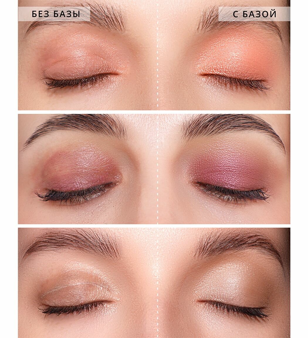 | Способ применения | нанесите аппликатором небольшое количество базы на веки и равномерно распределите. Дождитесь высыхания и наносите тени |