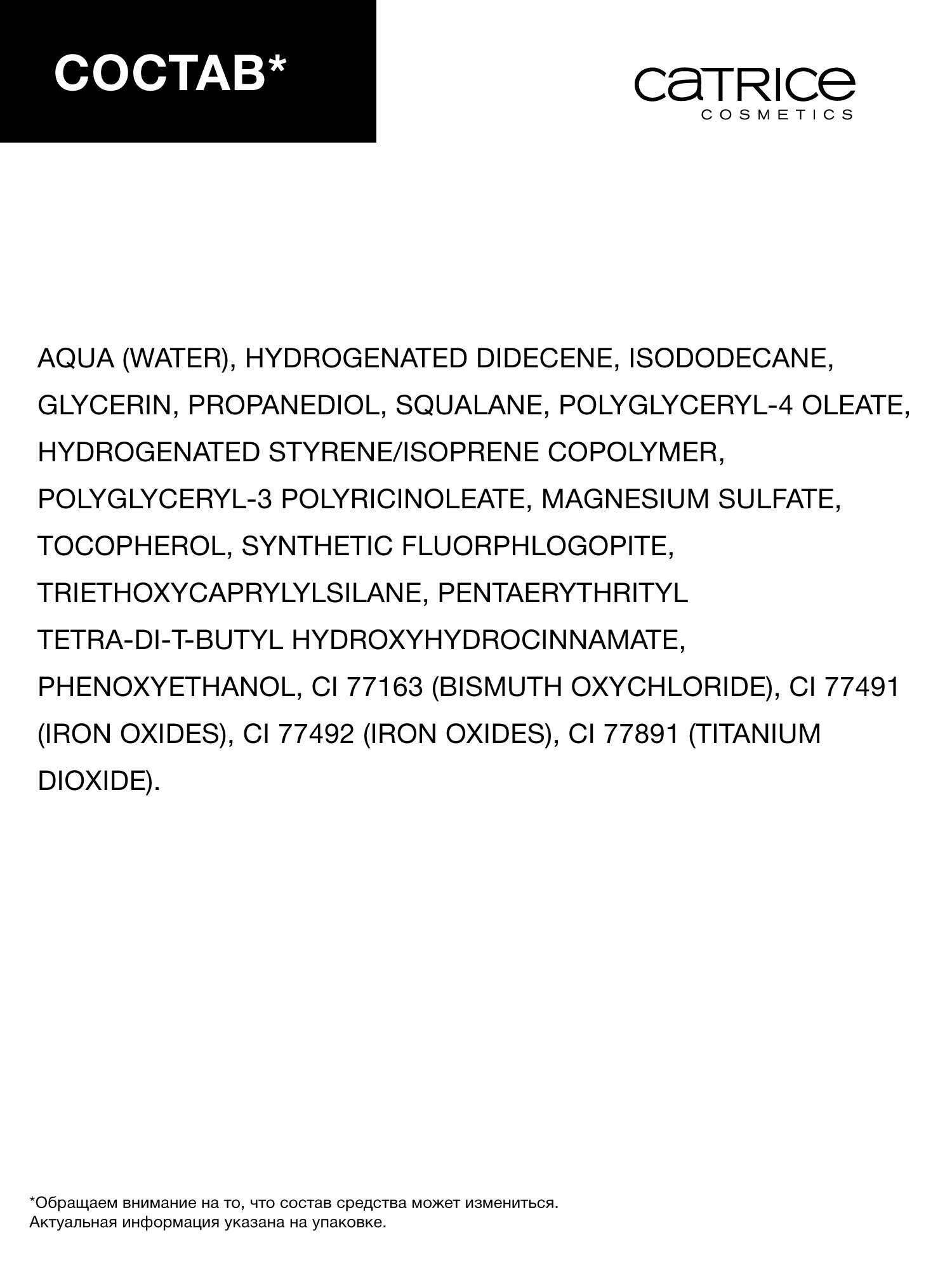 | Состав | AQUA (WATER), HYDROGENATED DIDECENE, ISODODECANE, PROPANEDIOL, GLYCERIN, SQUALANE, POLYGLYCERYL-4 OLEATE, HYDROGENATED STYRENE/ISOPRENE COPOLYMER, POLYGLYCERYL-3 POLYRICINOLEATE, MAGNESIUM SULFATE, TOCOPHEROL, SYNTHETIC FLUORPHLOGOPITE, TRIETHOXYCAPRYLYLSILANE, MICA, PENTAERYTHRITYL TETRA-DI-T-BUTYL HYDROXYHYDROCINNAMATE, PHENOXYETHANOL, TIN OXIDE, CI 77163 (BISMUTH OXYCHLORIDE), CI 77491 (IRON OXIDES), CI 77492 (IRON OXIDES), CI 77499 (IRON OXIDES), CI 77891 (TITANIUM DIOXIDE). |