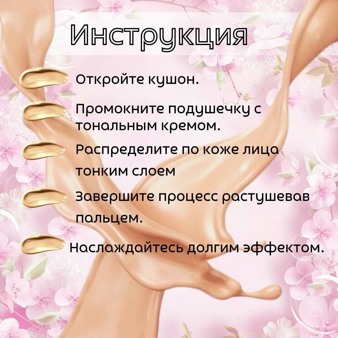 | Способ применения | Способ применения: После основного ухода за кожей возьмите необходимое количество этого средства, аккуратно нанесите его по текстуре кожи лица изнутри наружу и похлопайте, чтобы оно плотнее прилегало к коже лица. Можно повторно нанести кушон на области лица, которые нуждаются в маскирующем средстве. |