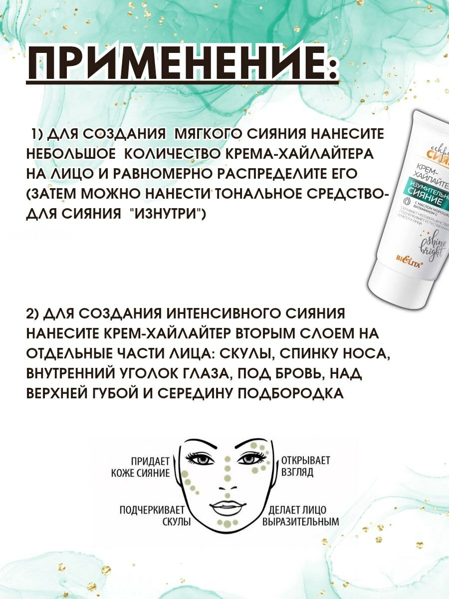 | Способ применения | для создания мягкого сияния нанесите небольшое количество крема-хайлайтера на лицо и равномерно распределите его. Для создания интенсивного сияния нанесите крем-хайлайтер вторым слоем на отдельные части лица: скулы, спинку носа, внутренний уголок глаза, под бровь, над верхней губой и середину подбородка |