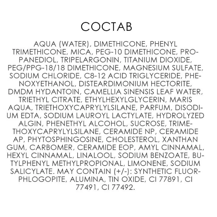 | Состав | aqua (water), dimethicone, phenyl trimethicone, mica, peg-10 dimethicone, propanediol, tripelargonin, titanium dioxide, peg/ppg-18/18 dimethicone, magnesium sulfate, sodium chloride, c8-12 acid triglyceride, phenoxyethanol, disteardimonium hectorite, dmdm hydantoin, camellia sinensis leaf water, triethyl citrate, ethylhexylglycerin, maris aqua, triethoxycaprylylsilane, parfum, disodium edta, sodium lauroyl lactylate, hydrolyzed algin, phenethyl alcohol, sucrose, trimethoxycaprylylsilane, ceramide np, ceramide ap, phytosphingosine, cholesterol, xanthan gum, carbomer, ceramide eop, amyl cinnamal, hexyl cinnamal, linalool, sodium benzoate, butylphenyl methylpropional, limonene, sodium salicylate. may contain (+/-): synthetic fluorphlogopite, alumina, tin oxide, ci 77891, ci 77491, ci 77492 |